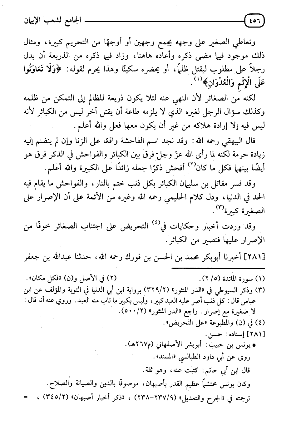 281 - أَخْبَرَنَا أَبُو بَكْرٍ مُحَمَّدُ بْنُ الْحَسَنِ بْنِ فُورَكٍ رَحِمَهُ اللهُ، حدثنا عَبْدُ اللهِ بْنُ جَعْفَرٍ -[457]- الْأَصْبَهَانِيُّ، حدثنا يُونُسُ بْنُ حَبِيبٍ، حدثنا أَبُو دَاوُدَ، حدثنا عِمْرَانُ الْقَطَّانُ، عَنْ قَتَادَةَ، عَنْ عَبْدِ رَبِّهِ، عَنْ أَبِي عِيَاضٍ، عَنْ عَبْدِ اللهِ بْنِ مَسْعُودٍ، أَنَّ رَسُولَ اللهِ صَلَّى اللَّهُ عَلَيْهِ وَسَلَّمَ قَالَ: §" إِيَّاكُمْ وَمُحَقَّرَاتِ الْأَعْمَالِ إِنَّهُنَّ يَجتَمِعْنَ عَلَى الرَّجُلِ حَتَّى يُهْلِكْنَهُ "، وَأَنَّ رَسُولَ اللهِ صَلَّى اللَّهُ عَلَيْهِ وَسَلَّمَ " ضَرَبَ لَهُنَّ مَثَلًا كَمَثَلِ قَوْمٍ نَزَلُوا بِأَرْضٍ فَلَاةٍ فَحَضَرَ صَنِيعُ الْقَوْمِ فَجَعَلَ الرَّجُلُ يَجِيءُ بِالْعُودِ، وَالرَّجُلُ يَجِيءُ بِالْعُوَيِّدِ حَتَّى جَمَعُوا مِنْ ذَلِكَ سَوَادًا، ثُمَّ أَجَّجُوا نَارًا فَأَنْضَجَتْ مَا قُذِفَ فِيهَا "