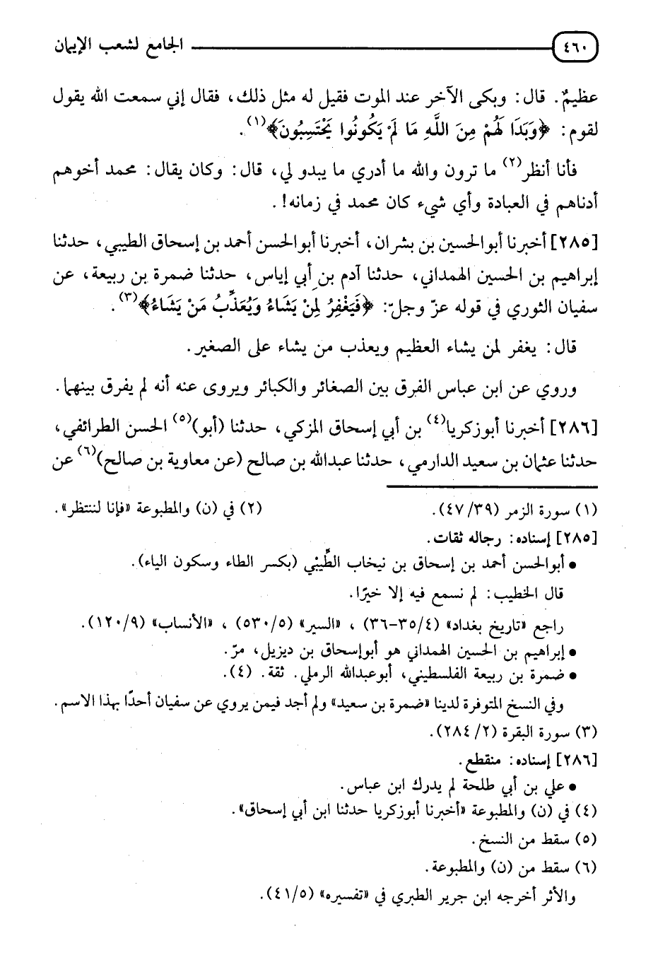 285 - أَخْبَرَنَا أَبُو الْحُسَيْنِ بْنُ بِشْرَانَ، أَخْبَرَنَا أَبُو الْحَسَنِ أَحْمَدُ بْنُ إِسْحَاقَ الطَّيْبِيُّ، حدثنا إِبْرَاهِيمُ بْنُ الْحُسَيْنِ الْهَمْدَانِيُّ، حدثنا آدَمُ بْنُ أَبِي إِيَاسٍ، حدثنا ضَمْرَةُ بْنُ رَبِيعَةَ، عَنْ سُفْيَانَ الثَّوْرِيِّ، فِي قَوْلِهِ عَزَّ وَجَلَّ: {§فَيَغْفِرُ لِمَنْ يَشَاءُ وَيُعَذِّبُ مَنْ يَشَاءُ} [البقرة: 284] قَالَ: " يَغْفِرُ لِمَنْ يَشَاءُ الْعَظِيمَ، وَيُعَذِّبُ مَنْ يَشَاءُ عَلَى الصَّغِيرِ " " وَرُوِيَ عَنِ ابْنِ عَبَّاسٍ الْفَرْقُ بَيْنَ الصَّغَائِرِ وَالْكَبَائِرِ، وَيُرْوَى عَنْهُ أَنَّهُ لَمْ يُفَرَّقٍ بَيْنَهُمَا "