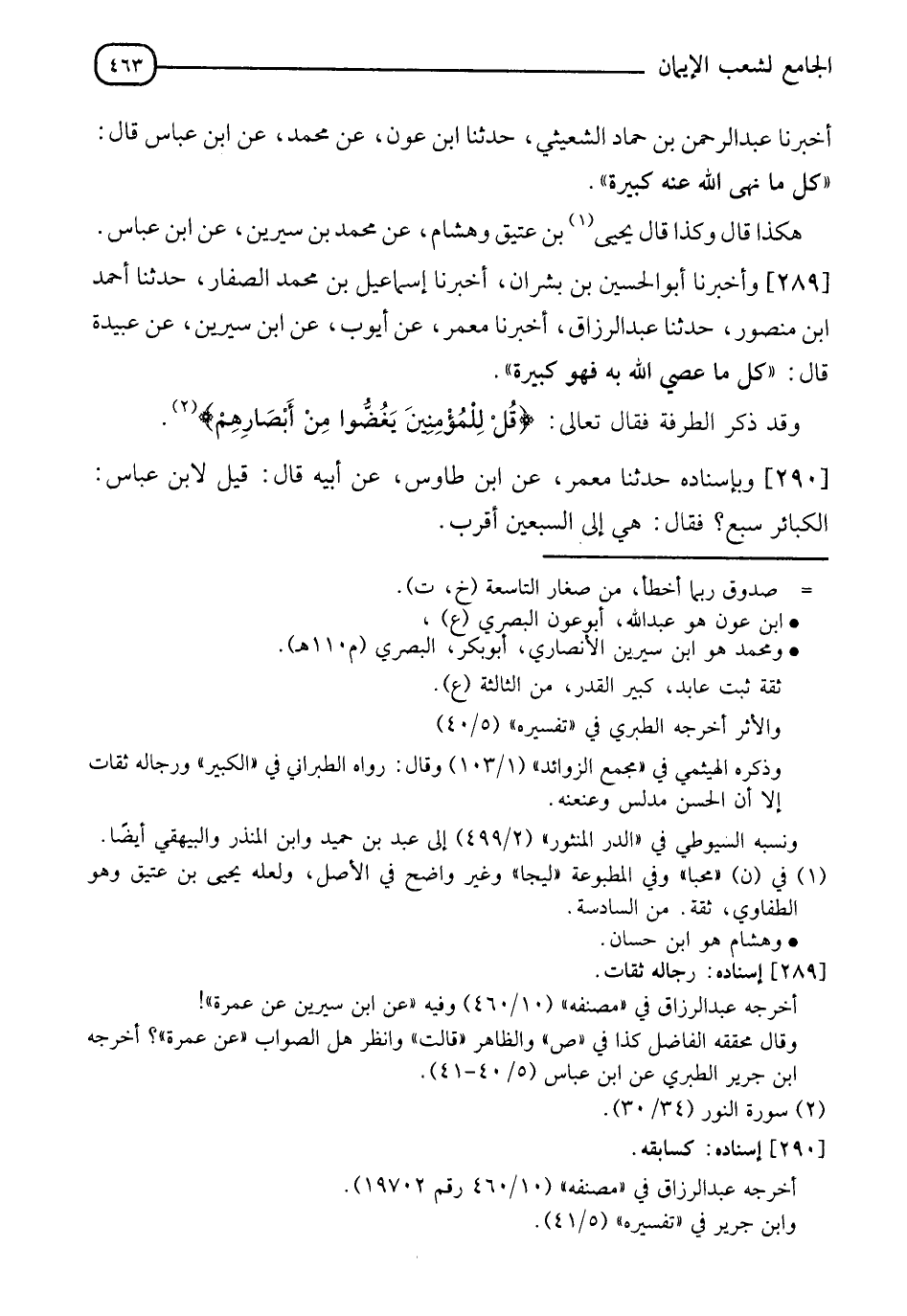 289 - وأَخْبَرَنَا أَبُو الْحُسَيْنِ بْنُ بِشْرَانَ، أَخْبَرَنَا إِسْمَاعِيلُ بْنُ مُحَمَّدٍ الصَّفَّارُ، حدثنا أَحْمَدُ بْنُ مَنْصُورٍ، حدثنا عَبْدُ الرَّزَّاقِ، أَخْبَرَنَا مَعْمَرٌ، عَنْ أَيُّوبَ، عَنِ ابْنِ سِيرِينَ، عَنْ عُبَيْدَةَ قَالَ: " §كُلُّ مَا عُصِيَ اللهُ بِهِ فَهُوَ كَبِيرَةٌ، وَقَدْ ذَكَرَ الطَّرْفَةَ فَقَالَ تَعَالَى: {قُلْ لِلْمُؤْمِنِينَ يَغُضُّوا مِنْ أَبْصَارِهِمْ} [النور: 30] "