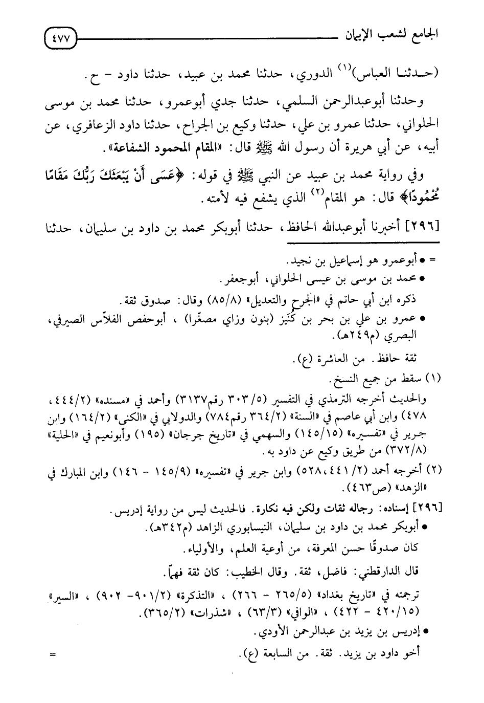 296 - أَخْبَرَنَا أَبُو عَبْدِ اللهِ الْحَافِظُ، حدثنا أَبُو بَكْرٍ مُحَمَّدُ بْنُ دَاوُدَ بْنِ سُلَيْمَانَ، حدثنا -[478]- عَبْدُ اللهِ بْنُ أَحْمَدَ الْأَهْوَازِيُّ، حدثنا أَبُو بَكْرِ بْنُ أَبِي شَيْبَةَ، فِي الْمُسْنَدِ، حدثنا وَكِيعٌ، عَنْ إِدْرِيسَ الْأَوْدِيِّ، عَنْ أَبِيهِ، عَنْ أَبِي هُرَيْرَةَ، عَنِ النَّبِيِّ صَلَّى اللَّهُ عَلَيْهِ وَسَلَّمَ {§عَسَى أَنْ يَبْعَثَكَ رَبُّكَ مَقَامًا مَحْمُودًا} [الإسراء: 79] قَالَ: " الشَّفَاعَةُ "
