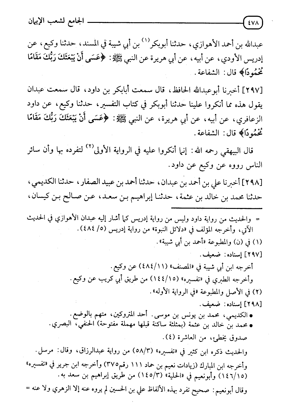 حَدَّثَنَا أَبُو بَكْرٍ، فِي كِتَابِ التَّفْسِيرِ، حَدَّثَنَا وَكِيعٌ، عَنْ دَاوُدَ الزَّعَافِرِيِّ، عَنْ أَبِيهِ، عَنْ أَبِي هُرَيْرَةَ، عَنِ النَّبِيِّ صَلَّى اللَّهُ عَلَيْهِ وَسَلَّمَ: {§عَسَى أَنْ يَبْعَثَكَ رَبُّكَ مَقَامًا مَحْمُودًا} [الإسراء: 79] قَالَ: " الشَّفَاعَةُ " قَالَ الْبَيْهَقِيُّ رَحِمَهُ اللهُ: " إِنَّمَا أَنْكَرُوا عَلَيْهِ فِي الرِّوَايَةِ الْأُولَى لِتَفَرُّدِهِ بِهَا، وَأَنَّ سَائِرَ النَّاسِ رَوَوْهُ، عَنْ وَكِيعٍ، عَنْ دَاوُدَ "
