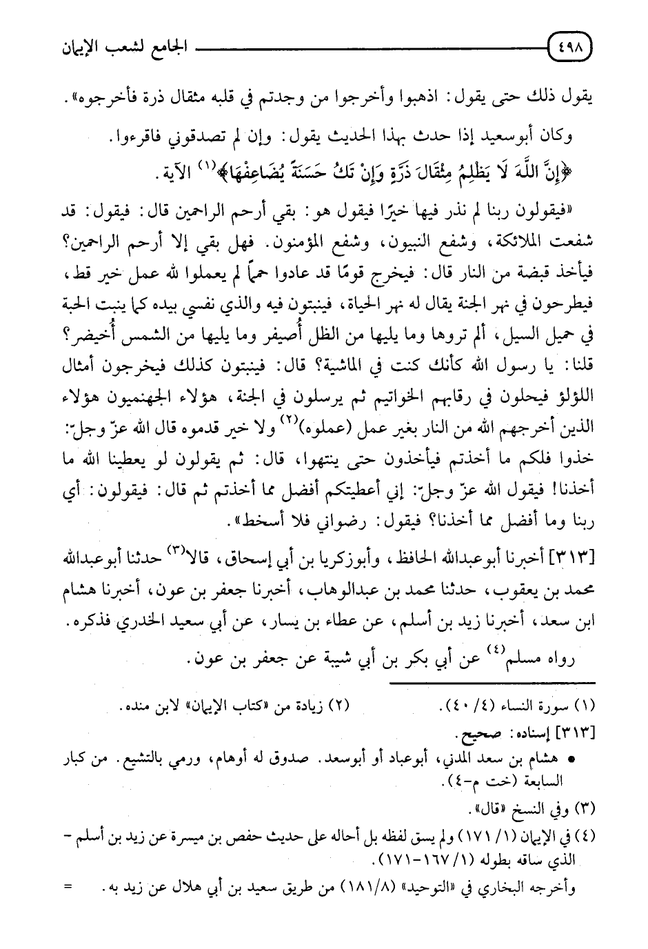 313 - " أَخْبَرَنَا أَبُو عَبْدِ اللهِ الْحَافِظُ، وَأَبُو زَكَرِيَّا بْنُ أَبِي إِسْحَاقَ قَالَا: حَدَّثَنَا أَبُو عَبْدِ اللهِ مُحَمَّدُ بْنُ يَعْقُوبَ، حدثنا مُحَمَّدُ بْنُ عَبْدِ الْوَهَّابِ، أَخْبَرَنَا جَعْفَرُ بْنُ عَوْنٍ، أَخْبَرَنَا هِشَامُ بْنُ سَعْدٍ، أَخْبَرَنَا زَيْدُ بْنُ أَسْلَمَ، عَنْ عَطَاءِ بْنِ يَسَارٍ، عَنْ أَبِي سَعِيدٍ الْخُدْرِيِّ فَذَكَرَهُ رَوَاهُ مُسْلِمٌ، عَنْ أَبِي بَكْرِ بْنِ أَبِي شَيْبَةَ، عَنْ جَعْفَرِ بْنِ عَوْنٍ -[499]- قَالَ الْبَيْهَقِيُّ رَحِمَهُ اللهُ: " وَأَخْرَجْنَا حَدِيثَ سَعِيدِ بْنِ الْمُسَيِّبِ، وَعَطَاءِ بْنِ يَزِيدَ، عَنْ أَبِي هُرَيْرَةَ، عَنِ النَّبِيِّ صَلَّى اللَّهُ عَلَيْهِ وَسَلَّمَ فِي هَذِهِ الْقِصَّةِ قَالَ فِي آخِرِهَا فَيَقُولُ لَهُ: " تَمَنَّ فَيَتَمَنَّى حَتَّى إِذَا انْقَطَعَ بِهِ قَالَ اللهُ عَزَّ وَجَلَّ: مِنْ كَذَا وَكَذَا، فَسَلْ يُذَكِّرُهُ رَبُّهِ حَتَّى إِذَا انْتَهَتْ بِهِ الْأَمَانِي قَالَ اللهُ تَعَالَى: لَكَ ذَلِكَ وَمِثْلُهُ مَعَهُ " قَالَ أَبُو سَعِيدٍ الْخُدْرِيُّ لِأَبِي هُرَيْرَةَ: أنَّ رَسُولَ اللهِ صَلَّى اللَّهُ عَلَيْهِ وَسَلَّمَ قَالَ: " لَكَ ذَلِكَ وَعَشَرَةُ أَمْثَالِهِ " وَرُوِّينَا فِي حَدِيثِ أَبِي صَالِحٍ، عَنْ أَبِي سَعِيدٍ، عَنِ النَّبِيِّ صَلَّى اللَّهُ عَلَيْهِ وَسَلَّمَ فِيمَنْ يَخْرُجُ مِنَ النَّارِ فَيَمْكُثُونَ فِي الْجَنَّةِ حِينًا فَيُقَالُ لَهُمْ هَلْ تَشْتَهُونَ شَيْئًا، فَيَقُولُونَ تَرْفَعَ عَنَّا هَذَا الِاسْمَ فَيُرْفَعُ عَنْهُمْ "