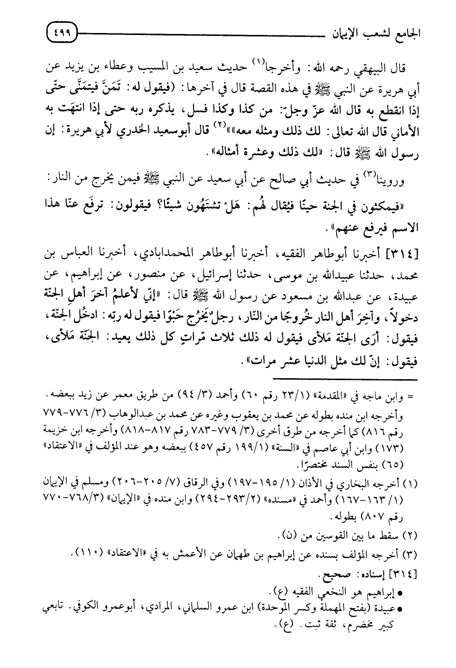 314 - أَخْبَرَنَا أَبُو طَاهِرٍ الْفَقِيهُ، أَخْبَرَنَا أَبُو طَاهِرٍ الْمُحَمَّدَ آبَادِيُّ، أَخْبَرَنَا الْعَبَّاسُ بْنُ مُحَمَّدٍ، حدثنا عُبَيْدُ اللهِ بْنُ مُوسَى، حدثنا إِسْرَائِيلُ، عَنْ مَنْصُورٍ، عَنْ إِبْرَاهِيمَ، عَنْ عَبِيْدَةَ، عَنْ عَبْدِ اللهِ بْنِ مَسْعُودٍ، عَنْ رَسُولِ اللهِ صَلَّى اللَّهُ عَلَيْهِ وَسَلَّمَ قَالَ: " إِنِّي لَأَعْلَمُ آخِرَ أَهْلِ الْجَنَّةِ دُخُولًا، وَآخِرَ أَهْلِ النَّارِ خُرُوجًا مِنَ النَّارِ رَجُلٌ يَخْرُجُ حَبْوًا، فَيَقُولُ لَهُ رَبُّهُ: §ادْخُلِ الْجَنَّةَ فَيَقُولُ: أَرَى الْجَنَّةَ مَلْأَى فَيَقُولُ: لَهُ ذَلِكَ ثَلَاثَ مَرَّاتٍ كُلُّ ذَلِكَ يُعِيدُ الْجَنَّةَ مَلْأَى فَيَقُولُ: إِنَّ لَكَ مِثْلَ الدُّنْيَا عَشْرَ مَرَّاتٍ " -[500]- رَوَاهُ الْبُخَارِيُّ فِي الصَّحِيحِ، عَنْ مُحَمَّدِ بْنِ خَالِدٍ، عَنْ عُبَيْدِ اللهِ وَأَخْرَجَاهُ، مِنْ حَدِيثِ جَرِيرٍ، عَنْ مَنْصُورٍ قَالَ الْبَيْهَقِيُّ رَحِمَهُ اللهُ: " وَقَدْ ذَكَرْنَا هَذِهِ الْأَخْبَارَ فِي كِتَابِ الْبَعْثِ وَالنُّشُورِ، بَعْضَهَا فِي أَبْوَابِ الشَّفَاعَةِ، وَبَعْضَهَا فِي أَبْوَابِ آخِرِ مَنْ يَخْرُجُ مِنَ النَّارِ، وَذَكَرْنَا مَعَهَا غَيْرَهَا، وَفِيمَا ذَكَرْنَاهُ هَهُنَا كِفَايَةٌ وَبِاللهِ التَّوْفِيقُ "
