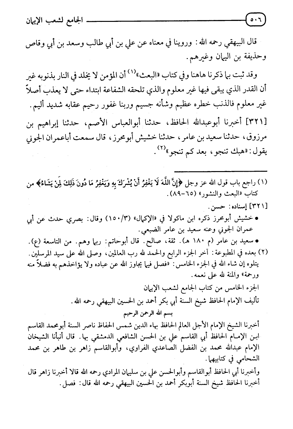 321 - أَخْبَرَنَا أَبُو عَبْدِ اللهِ الْحَافِظُ، حدثنا أَبُو الْعَبَّاسِ الْأَصَمُّ، حدثنا إِبْرَاهِيمُ بْنُ مَرْزُوقٍ، حدثنا سَعِيدُ بْنُ عَامِرٍ، حدثنا خُشَيْشٌ أَبُو مُحْرِزٍ قَالَ: سَمِعْتُ أَبَا عِمْرَانَ الْجَوْنِيَّ يَقُولُ: §" هَبْكَ تَنْجُو بَعْدُ كَمْ تَنْجُو "