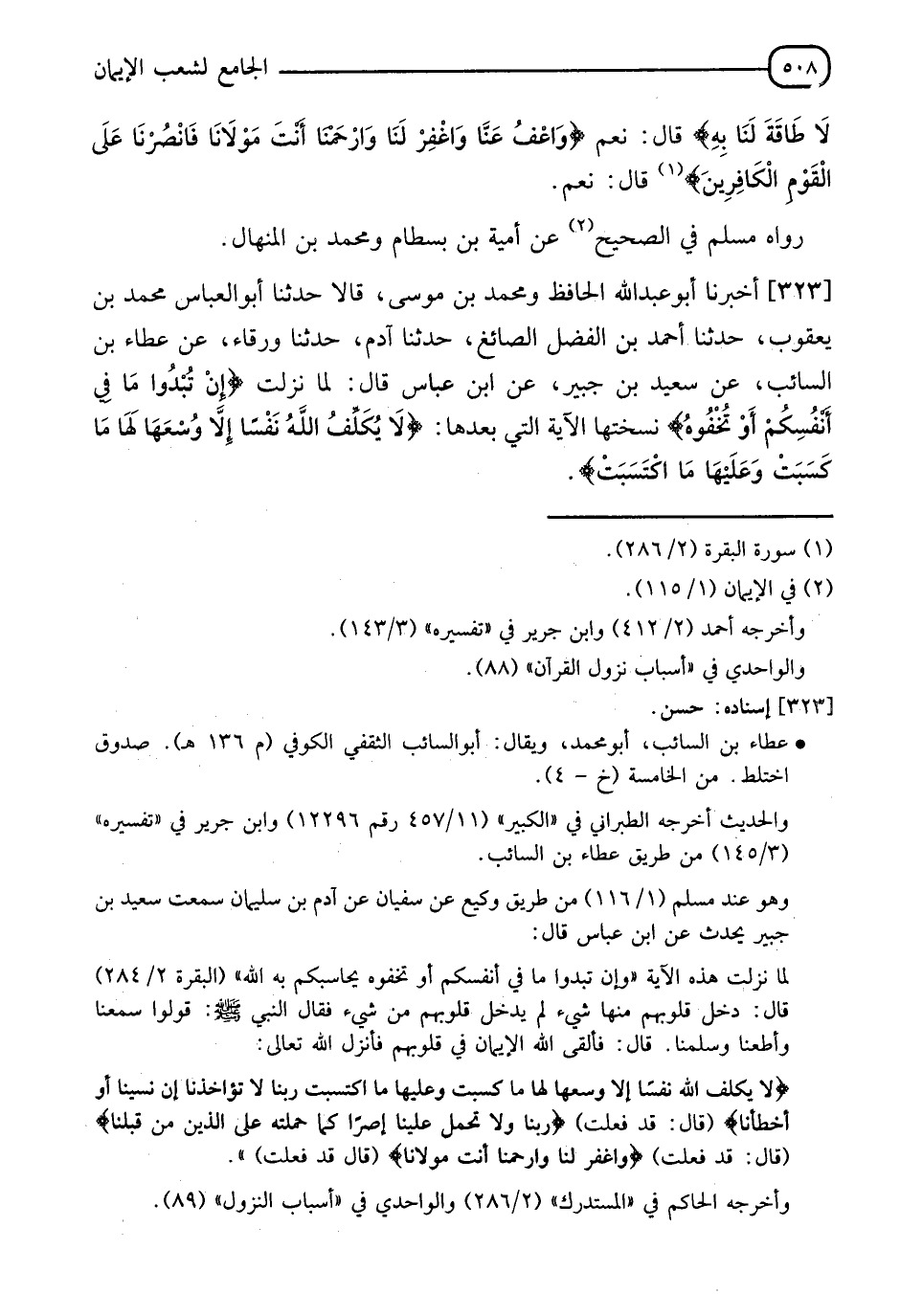 323 - أَخْبَرَنَا أَبُو عَبْدِ اللهِ الْحَافِظُ، وَمُحَمَّدُ بْنُ مُوسَى قَالَا، حدثنا أَبُو الْعَبَّاسِ مُحَمَّدُ بْنُ يَعْقُوبَ، حدثنا أَحْمَدُ بْنُ الْفَضْلِ الصَّائِغُ، حدثنا آدَمُ، حَدَّثَنَا وَرْقَاءُ، عَنْ عَطَاءِ بْنِ السَّائِبِ، عَنْ سَعِيدِ بْنِ جُبَيْرٍ، عَنِ ابْنِ عَبَّاسٍ، قَالَ: " §لَمَّا نَزَلَتْ {وَإِنْ تُبْدُوا مَا فِي أَنْفُسِكُمْ أَوْ تُخْفُوهُ} [البقرة: 284]، نَسَخَتْهَا الْآيَةُ الَّتِي بَعْدَهَا {لَا يُكَلِّفُ اللهُ نَفْسًا إِلَّا وُسْعَهَا لَهَا مَا كَسَبَتْ وَعَلَيْهَا مَا اكْتَسَبَتْ} [البقرة: 286] "