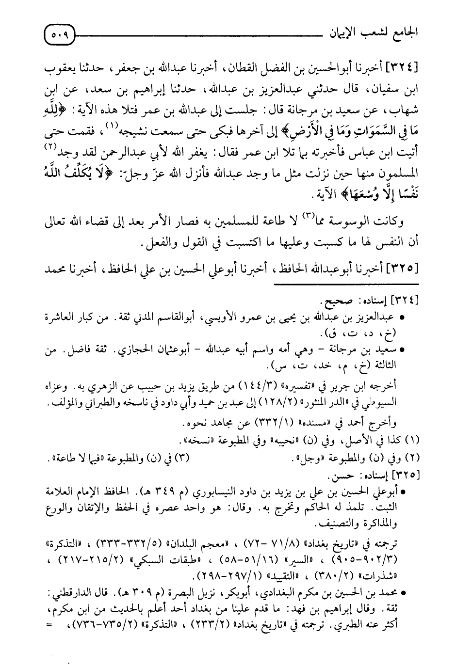324 - أَخْبَرَنَا أَبُو الْحُسَيْنِ بْنُ الْفَضْلِ الْقَطَّانُ، أَخْبَرَنَا عَبْدُ اللهِ بْنُ جَعْفَرٍ، حدثنا يَعْقُوبُ بْنُ سُفْيَانَ قَالَ: حَدَّثَنِي عَبْدُ الْعَزِيزِ بْنُ عَبْدِ اللهِ، حدثنا إِبْرَاهِيمُ بْنُ سَعْدٍ، عَنِ ابْنِ شِهَابٍ، عَنْ سَعِيدِ بْنِ مَرْجَانَةَ قَالَ: جَلَسْتُ إِلَى عَبْدِ اللهِ بْنِ عُمَرَ فَتَلَا هَذِهِ الْآيَةَ: {لِلَّهِ مَا فِي السَّمَوَاتِ وَمَا فِي الْأَرْضِ} إِلَى آخِرِهَا فَبَكَى حَتَّى سَمِعْتُ نَشِيجَهُ فَقُمْتُ حَتَّى أَتَيْتُ ابْنَ عَبَّاسٍ فَأَخْبَرْتُهُ بِمَا تَلَا ابْنُ عُمَرَ فَقَالَ: §" يَغْفِرُ اللهُ لِأَبِي عَبْدِ الرَّحْمَنِ لَقَدْ وَجَدَ الْمُسْلِمُونَ مِنْهَا حِينَ نَزَلَتْ مِثْلَ مَا وَجَدَ عَبْدُ اللهِ فَأَنْزَلَ اللهُ عَزَّ وَجَلَّ: {لَا يُكَلِّفُ اللهُ نَفْسًا إِلَّا وُسْعَهَا} [البقرة: 286] الْآيَةَ، وَكَانَتِ الْوَسْوَسَةُ مِمَّا لَا طَاعَةَ لِلْمُسْلِمِينَ بِهِ، فَصَارَ الْأَمْرُ بَعْدُ إِلَى قَضَاءِ اللهِ تَعَالَى أَنَّ النَّفْسَ لَهَا مَا كَسَبَتْ وَعَلَيْهَا مَا اكْتَسَبَتْ فِي الْقَوْلِ وَالْفِعْلِ "