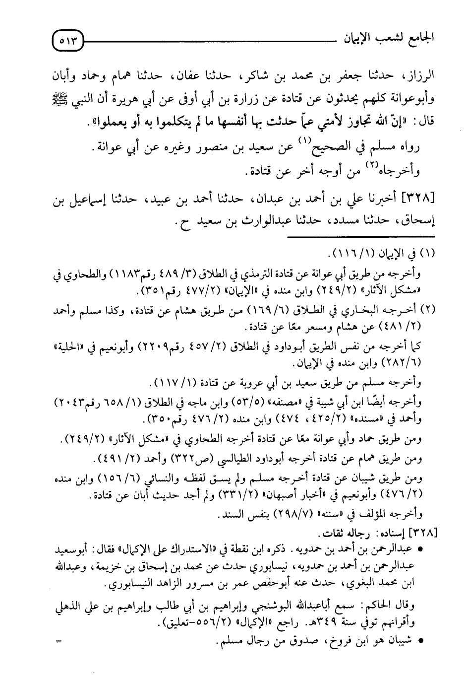 328 - أَخْبَرَنَا عَلِيُّ بْنُ أَحْمَدَ بْنِ عَبْدَانَ، حدثنا أَحْمَدُ بْنُ عُبَيْدٍ، حدثنا إِسْمَاعِيلُ بْنُ إِسْحَاقَ، حدثنا مُسَدَّدٌ، حدثنا عَبْدُ الْوَارِثِ بْنُ سَعِيدٍ، ح -[514]- وَأَخْبَرَنَا أَبُو عَبْدِ اللهِ الْحَافِظُ، أَخْبَرَنِي عَبْدُ الرَّحْمَنِ بْنُ أَحْمَدَ بْنِ حَمْدَوَيْهِ الْمُؤَذِّنُ، حدثنا عَبْدُ اللهِ بْنُ مُحَمَّدٍ الْبَغَوِيُّ، حدثنا شَيْبَانُ، عَنْ عَبْدِ الْوَارِثِ بْنُ سَعِيدٍ، حدثنا الْجَعْدُ أَبُو عُثْمَانَ، عَنْ أَبِي رَجَاءٍ الْعُطَارِدِيِّ، عَنِ ابْنِ عَبَّاسٍ، عَنِ النَّبِيِّ صَلَّى اللَّهُ عَلَيْهِ وَسَلَّمَ فِيمَا يَرْوِي عَنْ رَبِّهِ عَزَّ وَجَلَّ قَالَ: " إِنَّ §اللهَ كَتَبَ الْحَسَنَاتِ وَالسَّيِّئَاتِ، ثُمَّ بَيَّنَ ذَلِكَ فَمَنْ هَمَّ بِالْحَسَنَةِ فَلَمْ يَعْمَلْهَا كَتَبهاَ اللهُ لَهُ حَسَنَةً، وَمَنْ عَمِلَهَا كَتَبَ اللهُ لَهُ بِهَا عَشْرًا إِلَى سَبْعِ مِائَةِ ضِعْفٍ وَأَضْعَافٍ كَثِيرَةٍ، وَمَنْ هَمَّ بِسَيِّئَةٍ وَلَمْ يَعْمَلْهَا كَتَبَ اللهُ لَهُ بِهَا حَسَنَةً كَامِلَةً، وَمَنْ هَمَّ بِهَا فَعَمِلَهَا كَتَبَ اللهُ عَلَيْهِ سَيِّئَةً وَاحِدَةً " رَوَاهُ مُسْلِمٌ فِي الصَّحِيحِ، عَنْ شَيْبَانَ بْنِ فَرُّوخٍ