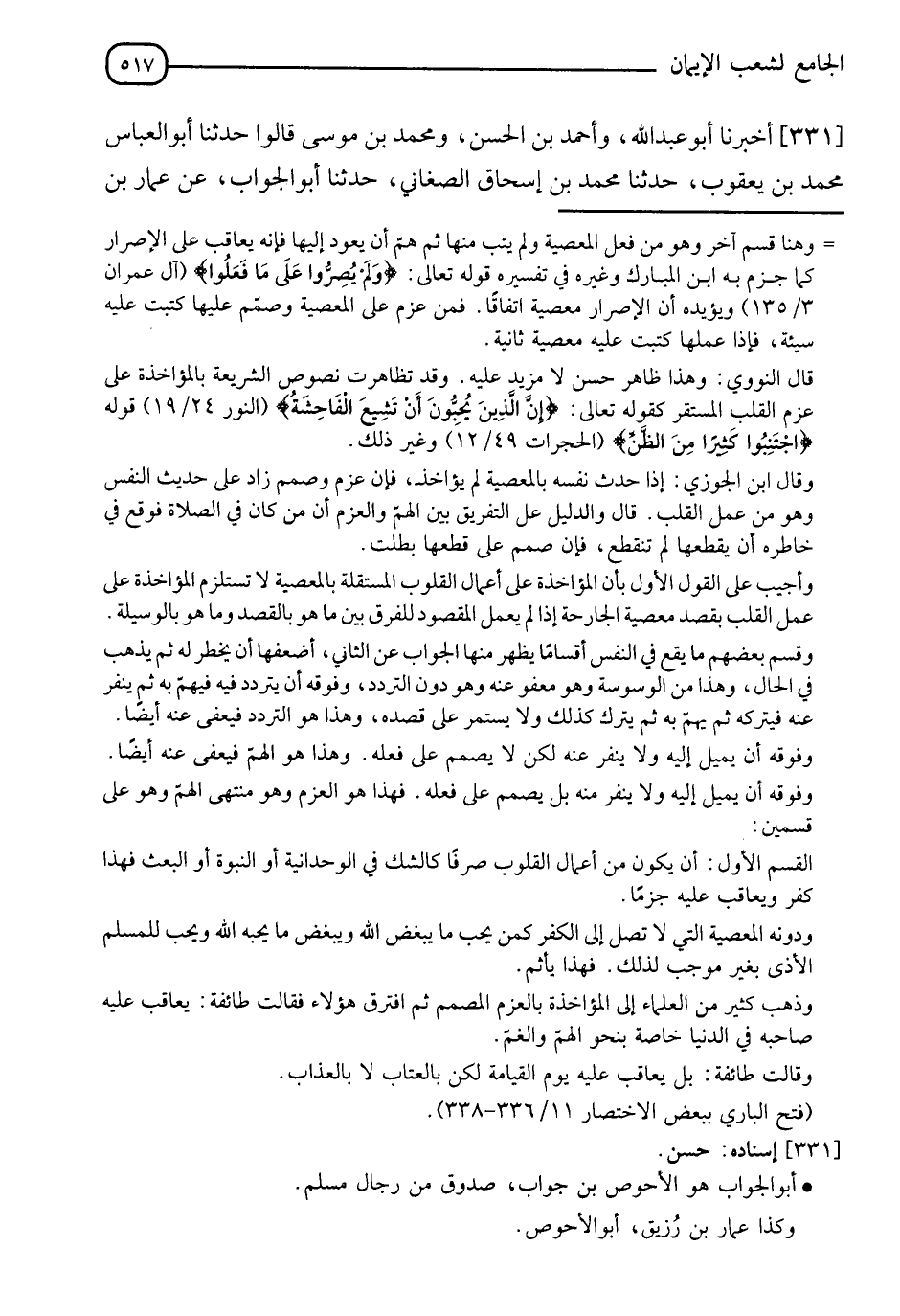 331 - أَخْبَرَنَا أَبُو عَبْدِ اللهِ، وَأَحْمَدُ بْنُ الْحَسَنِ، وَمُحَمَّدُ بْنُ مُوسَى قَالُوا: حدثنا أَبُو الْعَبَّاسِ مُحَمَّدُ بْنُ يَعْقُوبَ، حدثنا مُحَمَّدُ بْنُ إِسْحَاقَ الصَّغَانِيُّ، حدثنا أَبُو الْجَوَّابِ، عَنْ عَمَّارِ بْنِ -[518]- رُزَيْقٍ، عَنِ الْأَعْمَشِ، عَنْ أَبِي صَالِحٍ، عَنْ أَبِي هُرَيْرَةَ قَالَ: جَاءَ رَجُلٌ إِلَى النَّبِيِّ صَلَّى اللَّهُ عَلَيْهِ وَسَلَّمَ فَقَالَ: يَا رَسُولَ اللهِ، إِنِّي لَأُحَدِّثُ نَفْسِي بِالْحَدِيثِ لَأَنْ أَخِرَّ مِنَ السَّمَاءِ أَحَبُّ إِلَيَّ مِنْ أَنْ أَتَكَلَّمَ بِهِ قَالَ: " §ذَلِكَ صَرِيحُ الْإِيمَانِ " رَوَاهُ مُسْلِمٌ فِي الصَّحِيحِ، عَنِ الصَّغَانِيِّ