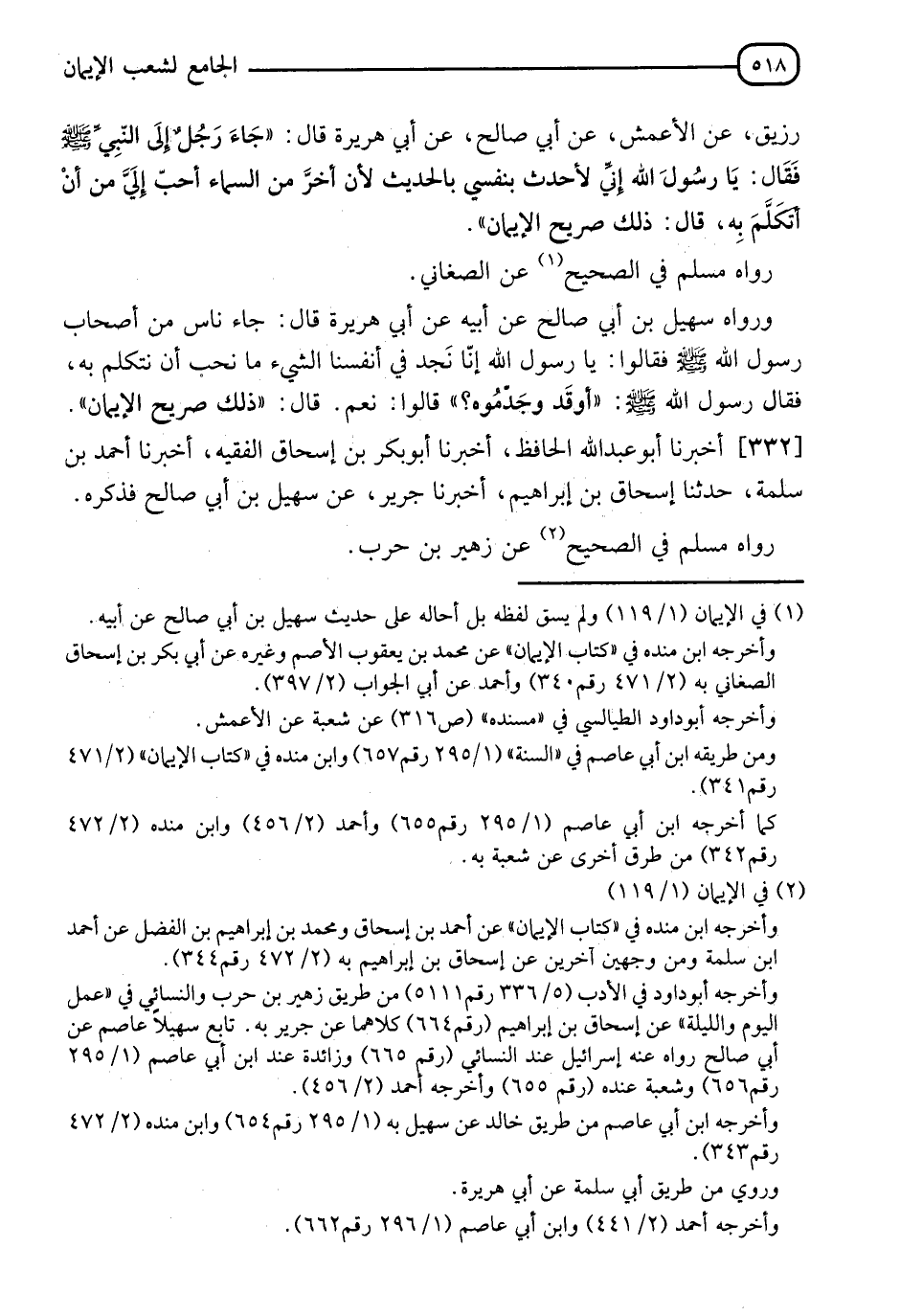 وَرَوَاهُ سُهَيْلُ بْنُ أَبِي صَالِحٍ، عَنْ أَبِيهِ، عَنْ أَبِي هُرَيْرَةَ قَالَ: جَاءَ نَاسٌ مِنْ أَصْحَابِ رَسُولِ اللهِ صَلَّى اللَّهُ عَلَيْهِ وَسَلَّمَ فَقَالُوا: يَا رَسُولَ اللهِ، إِنَّا نَجِدُ فِي أَنْفُسِنَا الشَّيْءَ مَا نُحِبُّ أَنْ نَتَكَلَّمَ بِهِ، فَقَالَ رَسُولُ اللهِ صَلَّى اللَّهُ عَلَيْهِ وَسَلَّمَ: " أَوَقَدْ وَجَدْتُمُوهُ؟ " قَالُوا نَعَمْ قَالَ: " §ذَلِكَ صَرِيحُ الْإِيمَانِ