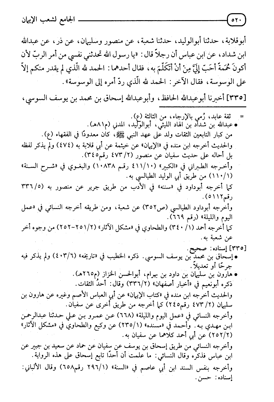 335 - أَخْبَرَنَا أَبُو عَبْدِ اللهِ الْحَافِظُ، وَأَبُو عَبْدِ اللهِ إِسْحَاقُ بْنُ مُحَمَّدِ بْنِ يُوسُفَ السُّوسِيُّ -[521]- وَمُحَمَّدُ بْنُ مُوسَى قَالُوا: حدثنا أَبُو الْعَبَّاسِ الْأَصَمُّ، حدثنا هَارُونُ بْنُ سُلَيْمَانَ الْأَصْبَهَانِيُّ، حدثنا عَبْدُ الرَّحْمَنِ بْنُ مَهْدِيٍّ، عَنْ سُفْيَانَ، عَنْ مَنْصُورٍ، عَنْ ذَرٍّ، عَنْ عَبْدِ اللهِ بْنِ شَدَّادٍ، عَنِ ابْنِ عَبَّاسٍ، أَنَّ رَجُلًا قَالَ لِلنَّبِيِّ صَلَّى اللَّهُ عَلَيْهِ وَسَلَّمَ: يَا رَسُولَ اللهِ، إِنِّي أَجِدُ فِي نَفْسِي شَيْئًا لَأَنْ أَكُونَ حُمَمَةً أَحَبُّ إِلَيَّ، فَقَالَ: §" الْحَمْدُ لِلَّهِ الَّذِي رَدَّ أَمْرَهُ إِلَى الْوَسْوَسَةِ "