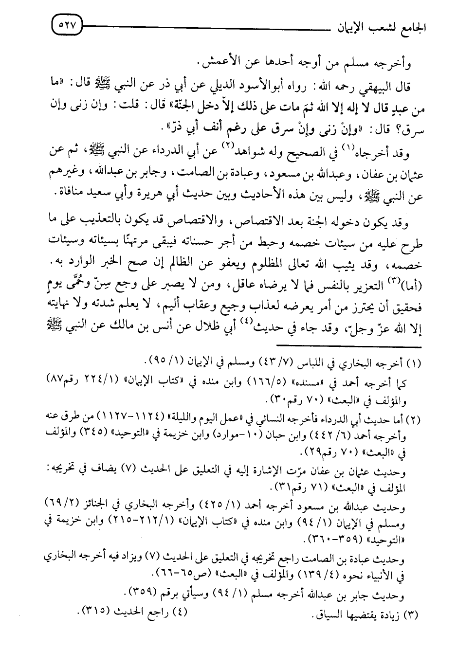 رَوَاهُ أَبُو الْأَسْوَدِ الدِّيلِيُّ، عَنْ أَبِي ذَرٍّ، عَنِ النَّبِيِّ صَلَّى اللَّهُ عَلَيْهِ وَسَلَّمَ قَالَ: " §مَا مِنْ عَبْدٍ قَالَ: لَا إِلَهَ إِلَّا اللهُ، ثُمَّ مَاتَ عَلَى ذَلِكَ إِلَّا دَخَلَ الْجَنَّةَ ". قَالَ: قُلْتُ: وَإِنْ زَنَى وَإِنْ سَرَقَ؟ قَالَ: " وَإِنْ زَنَى وَإِنْ سَرَقَ عَلَى رَغْمِ أَنْفِ أَبِي ذَرٍّ " وَقَدْ أَخْرَجَاهُ فِي الصَّحِيحِ، وَلَهُ شَوَاهِدُ عَنْ أَبِي الدَّرْدَاءِ، عَنِ النَّبِيِّ صَلَّى اللَّهُ عَلَيْهِ وَسَلَّمَ، ثُمَّ عَنْ عُثْمَانَ بْنِ عَفَّانَ، وَعَبْدِ اللهِ بْنِ مَسْعُودٍ، وَعُبَادَةَ بْنِ الصَّامِتِ، وَجَابِرِ بْنِ عَبْدِ اللهِ وَغَيْرِهِمْ، عَنِ النَّبِيِّ صَلَّى اللَّهُ عَلَيْهِ وَسَلَّمَ. " وَلَيْسَ بَيْنَ هَذِهِ الْأَحَادِيثِ، وَبَيْنَ حَدِيثِ أَبِي هُرَيْرَةَ، وَأَبِي سَعِيدٍ مُنَافَاةٌ، وَقَدْ يَكُونُ دُخُولُهُ الْجَنَّةَ بَعْدَ الِاقْتِصَاصِ، وَالِاقْتِصَاصُ قَدْ يَكُونُ بِالتَّعْذِيبِ عَلَى مَا طُرِحَ عَلَيْهِ مِنَ سَيِّئَاتِ خَصْمِهِ وَحَبِطَ مِنْ أَجْرِ حَسَنَاتِهِ فَيَبْقَى مُرْتَهِنًا بِسَيِّئَاتِهِ، وَسَيِّئَاتِ خَصْمِهِ، وَقَدْ يُثِيبُ اللهُ تَعَالَى الْمَظْلُومَ وَيَعْفُو عَنِ الظَّالِمِ إِنْ صَحَّ الْخَبَرُ الْوَارِدُ بِهِ، أَمَّا التَّعْزِيرُ بِالنَّفْسِ فَمَا لَا يَرْضَاهُ عَاقِلٌ، وَمَنْ لَا يَصْبِرُ عَلَى وَجَعِ سِنٍّ، وَحُمَّى يَوْمٍ فَحَقِيقٌ أَنْ يَحْتَرِزَ مِنْ أَمْرٍ يُعَرِّضُهُ لِعَذَابٍ وَجِيعٍ وِعِقَابٍ أَلِيمٍ لَا يَعْلَمُ شِدَّتَهُ وَلَا نِهَايَتَهُ إِلَّا اللهُ عَزَّ وَجَلَّ، وَقَدْ جَاءَ فِي حَدِيثِ أَبِي ظِلَالٍ، عَنْ أَنَسِ بْنِ مَالِكٍ، عَنِ النَّبِيِّ صَلَّى اللَّهُ عَلَيْهِ وَسَلَّمَ، -[528]- أَنَّ عَبْدًا فِي جَهَنَّمَ يُنَادِي أَلْفَ سَنَةٍ يَا حَنَّانُ يَا مَنَّانُ حَتَّى يَأْمُرَ بِهِ جِبْرِيلَ عَلَيْهِ السلامُ فَيُخْرِجَهُ مِنْهَا نَعُوذُ بِاللهِ مِنْ عَذَابِ اللهِ عَزَّ وَجَلَّ "