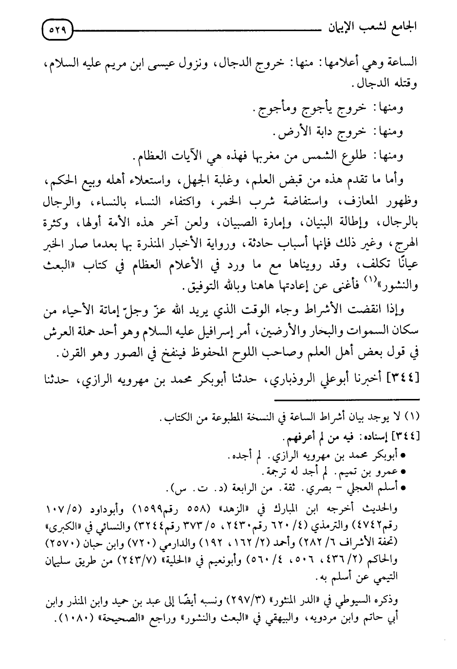 السَّاعَةِ، وَهِيَ أَعْلَامُهَا مِنْهَا خُرُوجُ الدَّجَّالِ، وَنُزُولُ عِيسَى ابْنِ مَرْيَمَ عَلَيْهِ السَّلَامُ وَقَتْلُهُ الدَّجَّالَ، وَمِنْهَا خُرُوجُ يَأْجُوجَ وَمَأْجُوجَ، وَمِنْهَا خُرُوجُ دَابَّةِ الْأَرْضِ، وَمِنْهَا طُلُوعُ الشَّمْسِ مِنْ مَغْرِبِهَا فَهَذِهِ هِيَ الْآيَاتُ الْعِظَامُ، وَأَمَّا مَا تَقَدَّمَ هَذِهِ مِنْ قَبْضِ الْعِلْمِ، وَغَلَبَةِ الْجَهْلِ وَاسْتِعْلَاءِ أَهْلِهِ، وَبَيْعِ الْحُكْمِ، وَظُهُورِ الْمَعَازِفِ، وَاسْتِفَاضَةِ شُرْبِ الْخَمْرِ، وَاكْتِفَاءِ النِّسَاءِ بِالنِّسَاءِ وَالرِّجَالِ بِالرِّجَالِ، وَإِطَالَةِ الْبُنْيَانِ، وَإِمَارَةِ الصِّبْيَانِ، وَلَعْنِ آخِرِ هَذِهِ الْأُمَّةِ أَوَّلَهَا، وَكَثْرَةِ الْهَرْجِ وَغَيْرِ ذَلِكَ فَإِنَّهَا أَسْبَابٌ حَادِثَةٌ، وَرِوَايَةُ الْأَخْبَارِ الْمُنْذِرَةِ بِهَا بَعْدَمَا صَارَ الْخَبَرُ عِيَانًا تَكَلُّفٌ، وَقَدْ رُوِّينَاهَا مَعَ مَا وَرَدَ فِي الْأَعْلَامِ الْعِظَامِ فِي كِتَابِ الْبَعْثِ وَالنُّشُورِ فَأَغْنَى عَنْ إِعَادَتِهَا هَهُنَا وَبِاللهِ التَّوْفِيقُ. وَإِذَا انْقَضَتِ الْأَشْرَاطُ، وَجَاءَ الْوَقْتُ الَّذِي يُرِيدُ اللهُ عَزَّ وَجَلَّ إِمَاتَةَ الْأَحْيَاءِ مِنْ سُكَّانِ السَّمَاوَاتِ وَالْبِحَارِ وَالْأَرَضِينَ أَمَرَ إِسْرَافِيلَ عَلَيْهِ السَّلَامُ وَهُوَ أَحَدُ حَمَلَةِ الْعَرْشِ فِي قَوْلِ بَعْضِ أَهْلِ الْعِلْمِ وَصَاحِبُ اللَّوْحِ الْمَحْفُوظِ فَيَنْفُخُ فِي الصُّورِ وَهُوَ الْقَرْنُ "