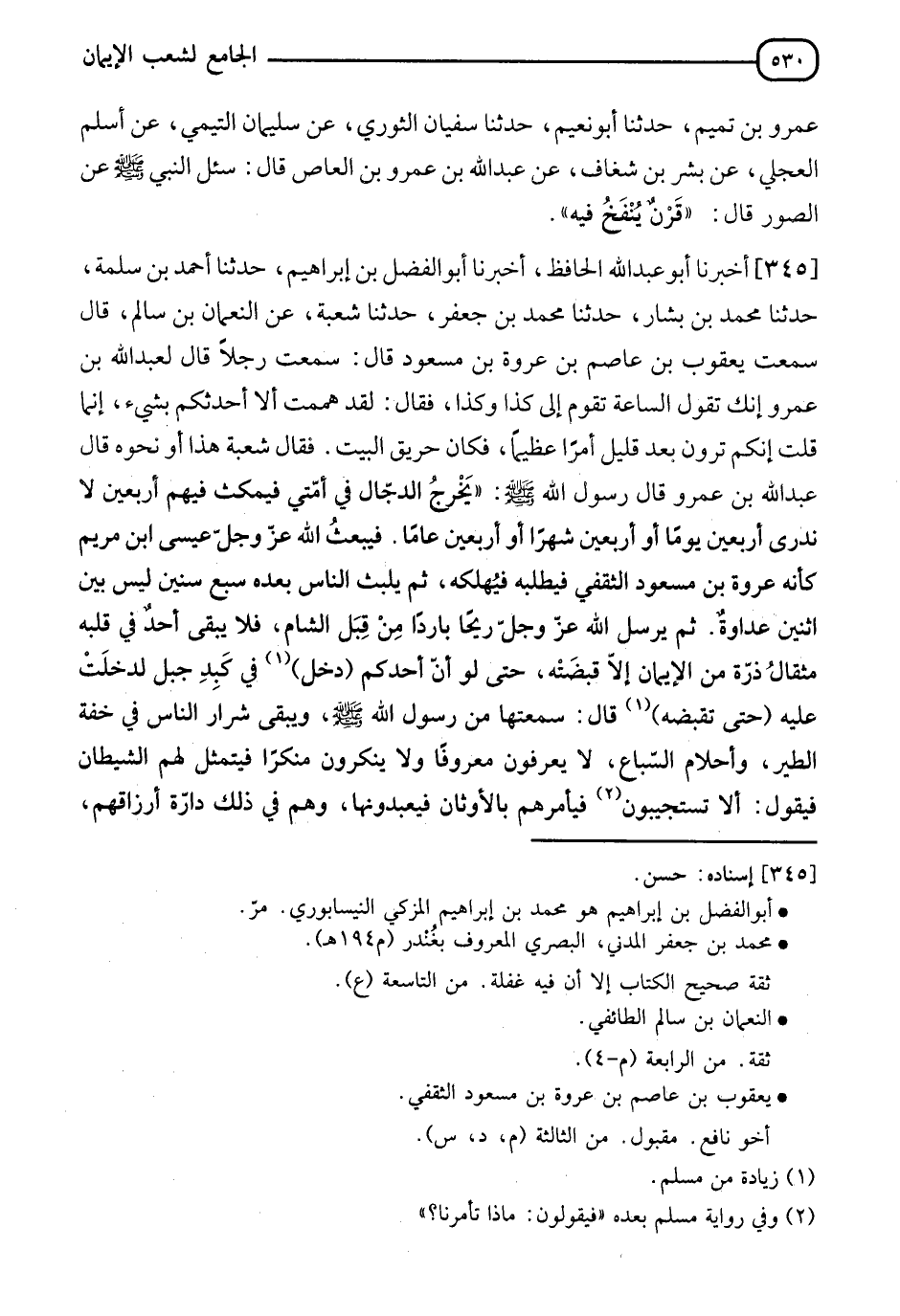 345 - أَخْبَرَنَا أَبُو عَبْدِ اللهِ الْحَافِظُ، أَخْبَرَنَا أَبُو الْفَضْلِ بْنُ إِبْرَاهِيمَ، حدثنا أَحْمَدُ بْنُ سَلَمَةَ، حدثنا مُحَمَّدُ بْنُ بَشَّارٍ، حدثنا مُحَمَّدُ بْنُ جَعْفَرٍ، حدثنا شُعْبَةُ، عَنِ النُّعْمَانِ بْنِ سَالِمٍ قَالَ: سَمِعْتُ يَعْقُوبَ بْنَ عَاصِمِ بْنِ عُرْوَةَ بْنِ مَسْعُودٍ قَالَ: سَمِعْتُ رَجُلًا قَالَ لِعَبْدِ اللهِ بْنِ عَمْرٍو: إِنَّكَ تَقُولُ: السَّاعَةُ تَقُومُ إلى كَذَا وَكَذَا، فَقَالَ: لَقَدْ هَمَمْتُ أَلَّا أُحَدِّثَكُمْ بِشَيْءٍ، إِنَّمَا قُلْتُ إِنَّكُمْ تَرَوْنَ بَعْدَ قَلِيلٍ أَمْرًا عَظِيمًا، فَكَانَ حَرِيقَ الْبَيْتِ فَقَالَ شُعْبَةُ: هَذَا أَوْ نَحْوَهُ قَالَ عَبْدُ اللهِ بْنُ عَمْرٍو قَالَ رَسُولُ اللهِ صَلَّى اللَّهُ عَلَيْهِ وَسَلَّمَ§" يَخْرُجُ الدَّجَّالُ فِي أُمَّتِي فَيَمْكُثُ فِيهِمْ أَرْبَعِينَ لَا نَدْرِي أَرْبَعِينَ يَوْمًا، أَوْ أَرْبَعِينَ شَهْرًا، أَوْ أَرْبَعِينَ عَامًا، فَيَبْعَثُ اللهُ عَزَّ وَجَلَّ عِيسَى ابْنَ مَرْيَمَ كَأَنَّهُ عُرْوَةُ بْنُ مَسْعُودٍ الثَّقَفِيُّ فَيَطْلُبُهُ فَيُهْلِكُهُ، ثُمَّ يَلْبَثُ النَّاسُ بَعْدَهُ سَبْعَ سِنِينَ لَيْسَ بَيْنَ اثْنَيْنِ عَدَاوَةٌ، ثُمَّ يُرْسِلُ اللهُ عَزَّ وَجَلَّ رِيحًا بَارِدًا مِنْ قِبَلِ الشَّامِ فَلَا يَبْقَى أَحَدٌ فِي قَلْبِهِ مِثْقَالُ ذَرَّةٍ مِنَ الْإِيمَانِ إِلَّا قَبْضَتْهُ حَتَّى لَوْ أَنَّ أَحَدَكُمْ دَخَلَ فِي كَبِدِ جَبَلٍ لَدَخَلَتْ عَلَيْهِ حتى تقبضه". قَالَ سَمِعْتُهَا مِنْ رَسُولِ اللهِ صَلَّى اللَّهُ عَلَيْهِ وَسَلَّمَ:" وَيَبْقَى شِرَارُ النَّاسِ فِي خِفَّةِ الطَّيْرِ، وَأَحْلَامِ السِّبَاعِ لَا يَعْرِفُونَ مَعْرُوفًا، وَلَا يُنْكِرُونَ مُنْكَرًا فَيَتَمَثَّلُ لَهُمُ الشَّيْطَانُ فَيَقُولُ: أَلَا تَسْتَجيبُونَ فَيَأْمُرُهُمْ بِالْأَوْثَانِ فَيَعْبُدُونَهَا وَهُمْ فِي ذَلِكَ دَارَّةٌ أَرْزَاقُهُمْ -[531]- حَسَنٌ عَيْشُهُمْ، ثُمَّ يُنْفَخُ فِي الصُّورِ فَلَا يَسْمَعُهُ أَحَدٌ إِلَّا أَصْغَى لِيتًا - وَرَفَعَ بُنْدَارُ إِحْدَى مَنْكِبَيْهِ -، وَأَوَّلُ مَنْ يَسْمَعُهُ رجل يَلُوطُ حَوْضَهُ فَيَصْعَقُ، ثُمَّ لَا يَبْقَى أَحَدٌ إِلَّا صَعِقَ ثُمَّ يُرْسِلُ الله، أَوْ يُنْزِلُ اللهُ مَطَرًا كَأَنَّهُ الطَّلُّ أَوِ الظِّلُّ، النُّعْمَانُ الشَّاكُّ فَتنْبُتُ مِنْهُ أَجْسَادُ النَّاسِ، ثُمَّ يُنْفَخُ فِيهِ أُخْرَى فَإِذَا هُمْ قِيَامٌ يَنْظُرُونَ، ثُمَّ يُقَالُ: يَا أَيُّهَا النَّاسُ هَلُمُّوا إِلَى رَبِّكُمْ عَزَّ وَجَلَّ وَقِفُوهُمْ إِنَّهُمْ مَسْئُولُونَ، ثُمَّ يُقَالُ: أَخْرِجُوا بَعْثَ النَّارِ فَيُقَالُ: كَمْ؟ فَيُقَالُ: مِنْ كُلِّ أَلْفٍ تِسْعُمِائَةٍ وَتِسْعَةٌ وَتِسْعُونَ" قَالَ مُحَمَّدُ بْنُ جَعْفَرٍ:" وَحَدَّثَنِي شُعْبَةُ بِهَذَا الْحَدِيثِ مَرَّاتٍ وَعَرَضْتُهُ عَلَيْهِ" رَوَاهُ مُسْلِمٌ فِي الصَّحِيحِ، عَنْ مُحَمَّدِ بْنِ بَشَّارٍ قَالَ الْبَيْهَقِيُّ رَحِمَهُ اللهُ:" وَلَمْ يَذْكُرْ عَبْدُ اللهِ بْنُ عَمْرٍو فِي هَذَا الْحَدِيثِ سَائِرَ الْأَعْلَامِ مِنْ خُرُوجِ يَأْجُوجَ وَمَأْجُوجَ، وَالدَّابَّةِ وَطُلُوعِ الشَّمْسِ مِنْ مَغْرِبِهَا، وَقَدْ ذَكَرَ غَيْرُهُ خُرُوجَ يَأْجُوجَ وَمَأْجُوجَ بَعْدَ نُزُولِ عِيسَى ابْنِ مَرْيَمَ وَإِرْسَالَ اللهِ عَلَيْهِمْ النَّغَفَ، وَمَوْتَهُمْ فِي قِيَامِ السَّاعَةِ بَعْدَ ذَلِكَ، وَذَكَرَ هُوَ عَنِ النَّبِيِّ صَلَّى اللَّهُ عَلَيْهِ وَسَلَّمَ أَنَّ أَوَّلَ الْآيَاتِ خُرُوجًا طُلُوعُ الشَّمْسِ مِنْ مَغْرِبِهَا، أوَ خُرُوجُ الدَّابَّةِ عَلَى النَّاسِ ضُحًى فَأَيُّهُمَا كَانَتْ قَبْلَ صَاحِبَتِهَا فَالْأُخْرَى عَلَى أَثَرِهَا، وَقَالَ مِنْ قِبَلِ نَفْسِهِ فَأَظُنُّ أَوَّلَهَا خُرُوجًا طُ
