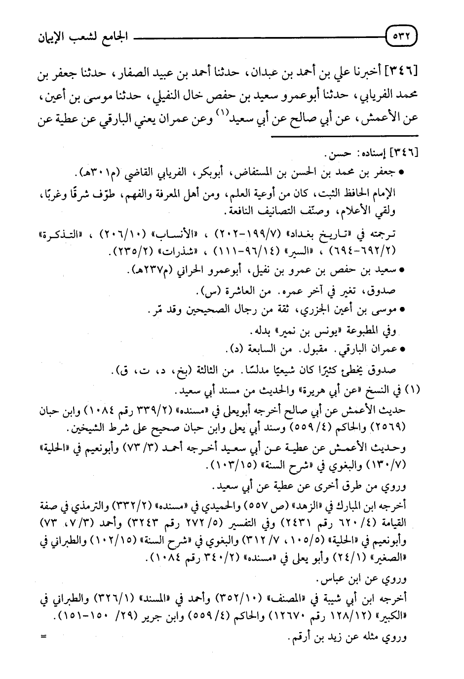 346 - أَخْبَرَنَا عَلِيُّ بْنُ أَحْمَدَ بْنِ عَبْدَانَ، حدثنا أَحْمَدُ بْنُ عُبَيْدٍ الصَّفَّارُ، حدثنا جَعْفَرُ بْنُ مُحَمَّدٍ الْفِرْيَابِيُّ، حدثنا أَبُو عَمْرٍو سَعِيدُ بْنُ حَفْصٍ خَالُ النُّفَيْلِيِّ، حدثنا مُوسَى بْنُ أَعْيَنَ، عَنِ الْأَعْمَشِ، عَنْ أَبِي صَالِحٍ، عَنْ أَبِي سَعِيدٍ، وَعَنْ عِمْرَانَ يَعْنِي الْبَارِقِيَّ، عَنْ عَطِيَّةَ، عَنْ -[533]- أَبِي سَعِيدٍ الْخُدْرِيِّ قَالَ: قَالَ رَسُولُ اللهِ صَلَّى اللَّهُ عَلَيْهِ وَسَلَّمَ " §كَيْفَ أَنْعَمُ وَصَاحِبُ الْقَرْنِ قَدِ الْتَقَمَهُ وَأَصْغَى سَمْعَهُ، وَحَنَا جَبِينَهُ يَنْتَظِرُ مَتَى يُؤْمَرُ فَيَنْفُخُ؟ " قَالُوا: يَا رَسُولَ اللهِ، كَيْفَ نَقُولُ؟ قَالَ: " قُولُوا: حَسْبُنَا اللهُ وَنِعْمَ الْوَكِيلُ عَلَى اللهِ تَوَكَّلْنَا " أَخْبَرَنَا أَبُو مُحَمَّدٍ عَبْدُ الرَّحْمَنِ بْنُ مُحَمَّدِ بْنِ بَالَوَيْهِ الْمُزَكِّي، أَخْبَرَنَا أَبُو الوَلِيدٍ الْفَقِيهُ، حدثنا إِبْرَاهِيمُ بْنُ عَلِيٍّ، حدثنا يَحْيَى بْنُ يَحْيَى، حدثنا مُوسَى بْنُ أَعْيَنَ، فَذَكَرَ حَدِيثَ أَبِي صَالِحٍ بِمَعْنَاهُ قَالَ الْبَيْهَقِيُّ رَحِمَهُ اللهُ: " فَإِذَا نُفِخَ فِي الصُّورِ فَصَعِقَ مَنْ فِي السَّمَاوَاتِ، وَمَنْ فِي الْأَرْضِ كَمَا قَالَ اللهُ عَزَّ وَجَلَّ: {وَنُفِخَ فِي الصُّورِ فَصَعِقَ مَنْ فِي السَّمَوَاتِ، وَمَنْ فِي الْأَرْضِ إِلَّا مَنْ شَاءَ اللهُ}، وَاخْتَلَفُوا فِي هَذَا الِاسْتِثْنَاءِ " فَرُوِيَ عَنْ جَابِرِ بْنِ عَبْدِ اللهِ أَنَّهُ قَالَ: " مُوسَى فِيمَنِ اسْتَثْنَى اللهُ، قَدْ صُعِقَ مَرَّةً "