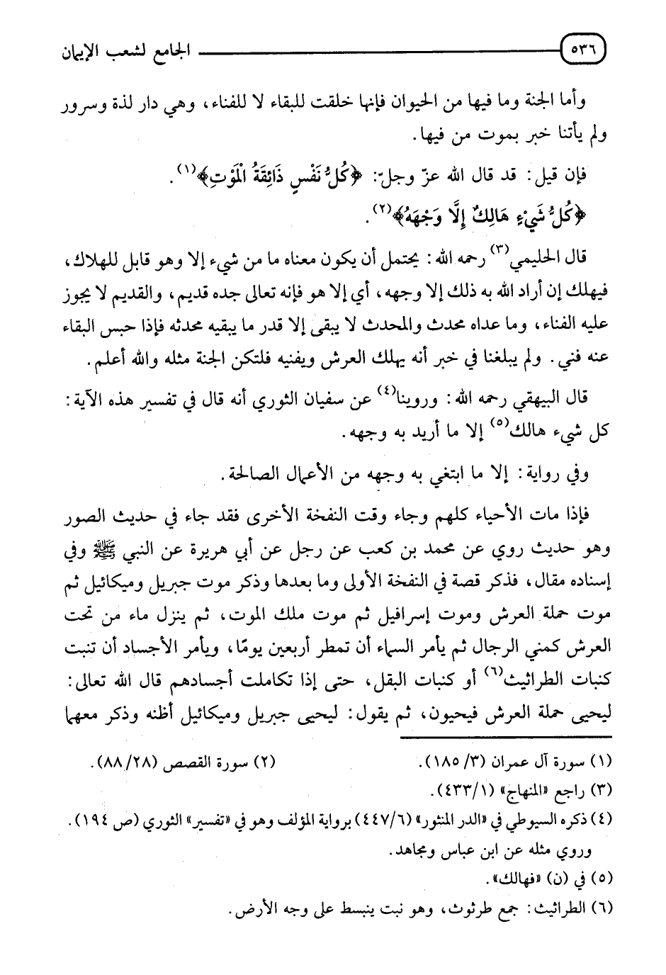 وَأَمَّا الْجَنَّةُ وَمَا فِيهَا مِنَ الْحَيَوَانِ فَإِنَّهَا خُلِقَتْ لِلْبَقَاءِ لَا لِلْفَنَاءِ، وَهِيَ دَارُ لَذَّةٍ وَسُرُورٍ، وَلَمْ يَأْتِنَا خَبَرٌ بِمَوْتِ مَنْ فِيهَا " فَإِنْ قِيلَ: قَدْ قَالَ اللهُ عَزَّ وَجَلَّ: {كُلُّ نَفْسٍ ذَائِقَةُ الْمَوْتِ}، {كُلُّ شَيْءٍ هَالِكٌ إِلَّا وَجْهَهُ} [القصص: 88] قَالَ الْحَلِيمِيُّ رَحِمَهُ اللهُ: " يَحْتَمِلُ أَنْ يَكُونَ مَعْنَاهُ مَا مِنْ شَيْءٍ إِلَّا وَهُوَ قَابِلٌ لِلْهَلَاكِ فَيَهْلِكُ إِنْ أَرَادَ اللهُ بِهِ ذَلِكَ إِلَّا وَجْهَهُ أَيْ إِلَّا هُوَ، فَإِنَّهُ تَعَالَى جَدُّهُ قَدِيمٌ وَالْقَدِيمُ لَا يَجُوزُ عَلَيْهِ الْفَنَاءُ وَمَا عَدَاهُ مُحْدَثٌ، وَالْمُحْدَثُ لا يَبْقَى إلا قَدْرُ مَا يُبْقِيَهُ مُحْدِثُهُ، فَإِذَا حُبِسَ الْبَقَاءُ عَنه فَنِيَ، وَلَمْ يَبْلُغْنَا فِي خَبَرٍ أَنَّهُ يُهْلِكُ الْعَرْشَ وَيُفْنِيهِ فَلْتَكُنِ الْجَنَّةُ مِثْلَهُ وَاللهُ أَعْلَمُ " قَالَ الْبَيْهَقِيُّ رَحِمَهُ اللهُ: وَرُوِّينَا، عَنْ سُفْيَانَ الثَّوْرِيِّ أَنَّهُ قَالَ: فِي تَفْسِيرِ هَذِهِ الْآيَةِ: " كُلُّ شَيْءٍ هَالِكٌ إِلَّا مَا أُرِيدَ بِهِ وَجْهَهُ " وَفِي رِوَايَةٍ: " إِلَّا مَا ابْتُغِيَ بِهِ وَجْهَهُ مِنَ الْأَعْمَالِ الصَّالِحَةِ " " فَإِذَا مَاتَ الْأَحْيَاءُ كُلُّهُمْ، وَجَاءَ وَقْتُ النَّفْخَةِ الْأُخْرَى فَقَدْ جَاءَ فِي حَدِيثِ الصُّورِ وَهُوَ حَدِيثٌ رُوِيَ عَنْ مُحَمَّدِ بْنِ كَعْبٍ، عَنْ رَجُلٍ، عَنْ أَبِي هُرَيْرَةَ، عَنِ النَّبِيِّ صَلَّى اللَّهُ عَلَيْهِ وَسَلَّمَ، وَفِي إِسْنَادِه مَقَالٌ فَذَكَرَ قِصَّةً فِي النَّفْخَةِ الْأُولَى وَمَا بَعْدَهَا " وَذَكَرَ مَوْتَ جِبْرِيلِ وَمِيكَائِيلَ، ثُمَّ مَوْتَ حَمَلَةِ الْعَرْشِ، وَمَوْتَ إِسْرَافِيلَ، ثُمَّ مَوْتَ مَلَكِ الْمَوْتِ، ثُمَّ يَنْزِلُ مَاءٌ مِنْ تَحْتِ الْعَرْشِ كَمَنِيِّ الرِّجَالِ، ثُمَّ يَأْمُرُ السَّمَاءَ أَنْ تُمْطِرَ أَرْبَعِينَ يَوْمًا، وَيَأْمُرُ الْأَجْسَادَ أَنْ تَنْبُتَ كَنَبَاتِ الطَّرَاثِيثِ، أَوْ كَنَبَاتِ الْبَقْلِ حَتَّى إِذَا تَكَامَلَتْ أَجْسَادُهُمْ قَالَ اللهُ تَعَالَى: لِيَحْيَى حَمَلَةُ الْعَرْشِ فَيَحْيَوْنَ، ثُمَّ يَقُولُ: لِيَحْيَى جِبْرِيلُ، وَمِيكَائِيلُ أَظُنُّهُ، وَذَكَرَ مَعَهُمَا