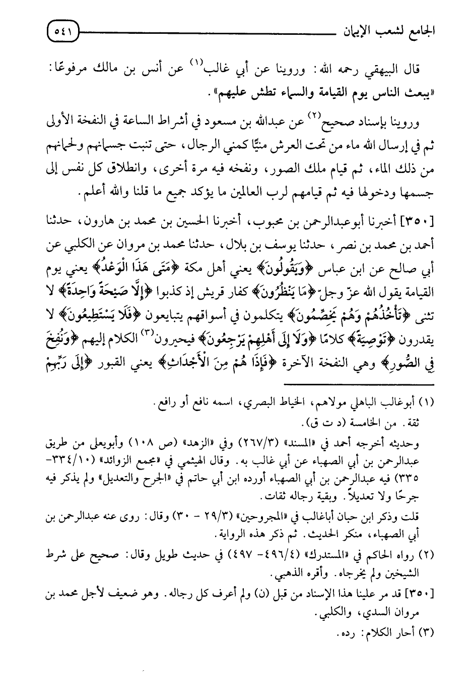 350 - أَخْبَرَنَا أَبُو عَبْدِ الرَّحْمَنِ بْنُ مَحْبُوبٍ، أَخْبَرَنَا الْحُسَيْنُ بْنُ مُحَمَّدِ بْنِ هَارُونَ، حدثنا أَحْمَدُ بْنُ مُحَمَّدِ بْنِ نَصْرٍ، حدثنا يُوسُفُ بْنُ بِلَالٍ، حدثنا مُحَمَّدُ بْنُ مَرْوَانَ، عَنِ الْكَلْبِيِّ، عَنْ أَبِي صَالِحٍ، عَنِ ابْنِ عَبَّاسٍ، {§وَيَقُولُونَ} [يس: 48]: " يَعْنِي أَهْلَ مَكَّةَ ". {مَتَى هَذَا الْوَعْدُ} [يس: 48] " يَعْنِي يوم الْقِيَامَةِ ". يَقُولُ اللهُ عَزَّ وَجَلَّ: {مَا يَنْظُرُونَ} [يس: 49] " كُفَّارُ قُرَيْشٍ إِذْ كَذَّبُوا ". {إِلَّا صَيْحَةً وَاحِدَةً} [يس: 49] " لَا تُثَنَّى " {تَأْخُذُهُمْ وَهُمْ يَخِصُّمُونَ} [يس: 49] " يتكلَّمُونَ فِي أَسْوَاقِهِمْ يَتَبَايَعُونَ " {فَلَا يَسْتَطِيعُونَ} [يس: 50] " لَا يَقْدِرُونَ "، {تَوْصِيَةً} [يس: 50] " كَلَامًا "، {وَلَا إِلَى أَهْلِهِمْ يَرْجِعُونَ} [يس: 50] " فَيُخَيَّرُونَ الْكَلَامَ إِلَيْهِمْ "، {وَنُفِخَ فِي الصُّورِ} [يس: 51] " وَهِيَ النَّفْخَةُ الْآخِرَةُ " {فَإِذَا هُمْ مِنَ الْأَجْدَاثِ} [يس: 51] " يَعْنِي الْقُبُورَ "، {إِلَى رَبِّهِمْ -[542]- يَنْسِلُونَ} [يس: 51] " يَخْرُجُونَ مِنْ قُبُورِهِمْ ". {قَالُوا: يَا وَيْلَنَا مَنْ بَعَثَنَا مِنْ مَرْقَدِنَا} [يس: 52] " يَقُولُ: مِنْ مَنَامِنَا، يَقُولُ: هَذَا بَعْضُهُمْ لِبَعْضٍ إِذَا خَرَجُوا مِنَ الْقُبُورِ، وَظَنُّوا أَنَّهُمْ كَانُوا نِيَامًا، وَذَلِكَ أَنْهُ يُرْفَعَ عَنْهُمُ الْعَذَابُ بَيْنَ النَّفْخَتَيْنِ وَبَيْنَهُمَا أَرْبَعُونَ سَنَةً نَسُوا الْعَذَابَ، فَقَالَتْ لَهُمُ الْمَلَائِكَةُ: {هَذَا مَا وَعَدَ الرَّحْمَنُ، وَصَدَقَ الْمُرْسَلُونَ} [يس: 52] " يَعْنِي وَتَصْدِيقُ الْمُرْسَلِينَ الْبَعْثَ يَقُولُ اللهُ عَزَّ وَجَلَّ: {إِنْ كَانَتْ إِلَّا صَيْحَةً وَاحِدَةً} [يس: 29] " نَفْخَةً وَاحِدَةً "، {فَإِذَا هُمْ جَمِيعٌ لَدَيْنَا مُحْضَرُونَ} [يس: 53] " الْحِسَابَ " قَالَ الْبَيْهَقِيُّ رَحِمَهُ اللهُ: