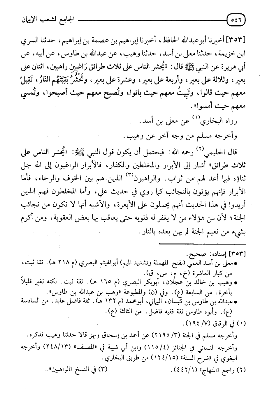 353 - أَخْبَرَنَا أَبُو عَبْدِ اللهِ الْحَافِظُ، أَخْبَرَنَا إِبْرَاهِيمُ بْنُ عِصْمَةَ بْنِ إِبْرَاهِيمَ، حدثنا السَّرِيُّ بْنُ خُزَيْمَةَ، حدثنا مُعَلَّى بْنُ أَسَدٍ، حدثنا وُهَيْبٌ، عَنْ عَبْدِ اللهِ بْنِ طَاوُسٍ، عَنْ أَبِيهِ، عَنْ أَبِي هُرَيْرَةَ، عَنِ النَّبِيِّ صَلَّى اللَّهُ عَلَيْهِ وَسَلَّمَ قَالَ: §" يُحْشَرُ النَّاسُ عَلَى ثَلَاثِ طَرَائِقَ رَاغِبِينَ رَاهِبِينَ اثْنَانِ عَلَى بَعِيرٍ، وَثَلَاثَةٌ عَلَى بَعِيرٍ، وَأَرْبَعَةٌ عَلَى بَعِيرٍ، وَعَشَرَةٌ عَلَى بَعِيرٍ، وَتَحْشُرُ بَقِيَّتَهُمُ النَّارُ تَقِيلُ مَعَهُمْ حَيْثُ قَالُوا، وَتَبِيتُ مَعَهُمْ حَيْثُ بَاتُوا وَتُصْبِحُ مَعَهُمْ حَيْثُ أَصْبَحُوا، وَتُمْسِي مَعَهُمْ حَيْثُ أَمْسَوْا " رَوَاهُ الْبُخَارِيُّ، عَنْ مُعَلَّى بْنِ أَسَدٍ وَأَخْرَجَهُ مُسْلِمٌ مِنْ وَجْهٍ آخَرَ، عَنْ وُهَيْبٍ قَالَ الْحَلِيمِيُّ رَحِمَهُ اللهُ: " فَيُحْتَمَلُ أَنْ يَكُونَ قَوْلُ النَّبِيِّ صَلَّى اللَّهُ عَلَيْهِ وَسَلَّمَ: " يُحْشَرُ النَّاسُ عَلَى ثَلَاثِ طَرَائِقَ " أَشَارَ إِلَى الْأَبْرَارِ، وَالْمُخَلَّطِينَ وَالْكُفَّارِ فَالْأَبْرَارُ الرَّاغِبُونُ إِلَى اللهِ جَلَّ ثَنَاؤُهُ فِيمَا أَعَدَّ لَهُمْ مِنْ ثَوَابٍ، وَالرَّاهِبِينَ الَّذِينَ هُمْ بَيْنَ الْخَوْفِ، وَالرَّجَاءِ فَأَمَّا الْأَبْرَارُ: فَإِنَّهُمْ يُؤْتَوْنَ بِالنَّجَائِبِ كَمَا رُوِيَ فِي حَدِيثِ عَلِيٍّ، وَأَمَّا الْمُخَلَّطُونُ فَهُمُ الَّذِينَ أُرِيدُوا فِي هَذَا الْحَدِيثِ، أَنَّهُمْ يُحْمَلُونَ عَلَى الْأَبعِرَةِ وَالْأَشْبَهُ أَنَّهَا لَا تَكُونُ مِنْ نَجَائِبِ الْجَنَّةِ لِأَنَّ مِنْ هَؤُلَاءِ مَنْ لَا يُغْفَرُ لَهُ ذُنُوبُهُ حَتَّى يُعَاقَبَ بِهَا بَعْضَ الْعُقُوبَةِ، وَمَنْ أُكْرِمَ بِشَيْءٍ مِنْ نَعِيمِ الْجَنَّةِ، لَمْ يُهَنْ بَعْدَهُ بِالنَّارِ " -[547]- قَالَ الْبَيْهَقِيُّ رَحِمَهُ اللهُ: