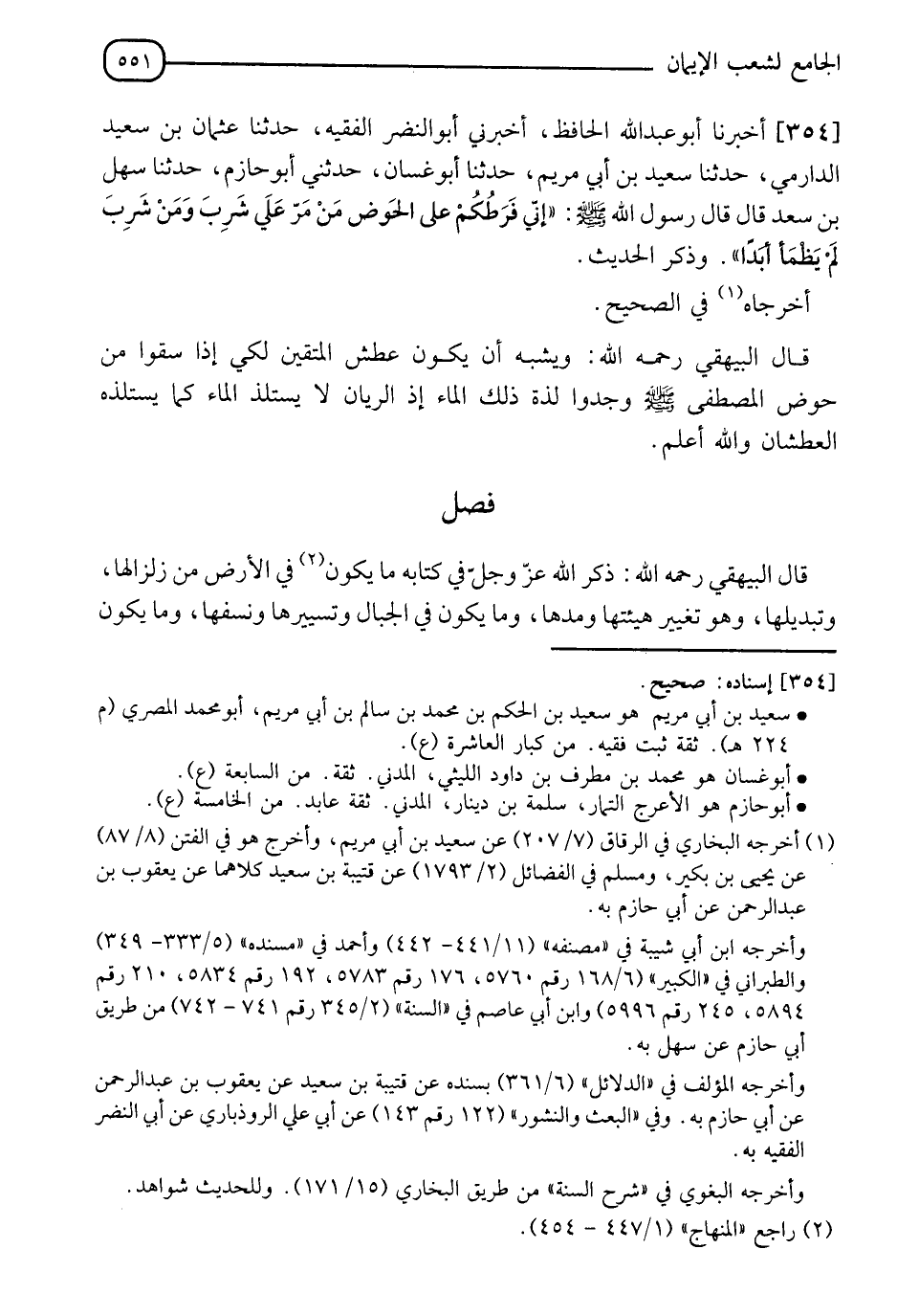 354 - أَخْبَرَنَا أَبُو عَبْدِ اللهِ الْحَافِظُ، أَخْبَرَنِي أَبُو النَّضْرِ الْفَقِيهُ، حدثنا عُثْمَانُ بْنُ سَعِيدٍ الدَّارِمِيُّ، حدثنا سَعِيدُ بْنُ أَبِي مَرْيَمَ، حدثنا أَبُو غَسَّانَ، حَدَّثَنِي أَبُو حَازِمٍ، حدثنا سَهْلُ بْنُ سَعْدٍ قَالَ: قَالَ رَسُولُ اللهِ صَلَّى اللَّهُ عَلَيْهِ وَسَلَّمَ: " §إِنِّي فَرَطُكُمْ عَلَى الْحَوْضِ مَنْ مَرَّ عَلَيَّ شَرِبَ، وَمَنْ شَرِبَ لَمْ يَظْمَأْ أَبَدًا " وَذَكَرَ الْحَدِيثَ أَخْرَجَاهُ فِي الصَّحِيحِ قَالَ الْبَيْهَقِيُّ رَحِمَهُ اللهُ: " وَيُشْبِهُ أَنْ يَكُونَ عَطَشُ الْمُتَّقِينَ لِكَيْ إِذَا سُقُوا مِنْ حَوْضِ الْمُصْطَفَى صَلَّى اللَّهُ عَلَيْهِ وَسَلَّمَ وَجَدُوا لَذَّةَ ذلك الْمَاءِ إِذْ الرَّيَّانُ، لَا يَسْتَلِذُّ الْمَاءَ كَمَا يَسْتَلِذُّهُ الْعَطْشَانُ، وَاللهُ أَعْلَمُ "