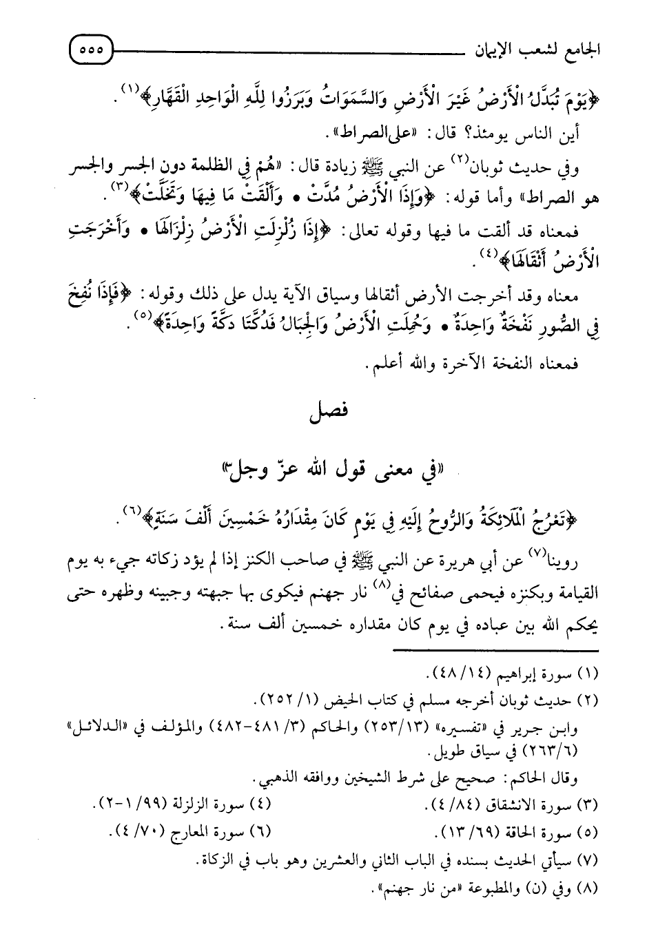 §فَصْلٌ " فِي مَعْنَى قَوْلِ اللهِ عَزَّ وَجَلَّ: {تَعْرُجُ الْمَلَائِكَةُ، وَالرُّوحُ إِلَيْهِ فِي يَوْمٍ كَانَ مِقْدَارُهُ خَمْسِينَ أَلْفَ سَنَةٍ} [المعارج: 4] رُوِّينَا، عَنْ أَبِي هُرَيْرَةَ، عَنِ النَّبِيِّ صَلَّى اللَّهُ عَلَيْهِ وَسَلَّمَ فِي صَاحِبِ الْكَنْزِ إِذَا لَمْ يُؤَدِّ زَكَاتَهُ جِيئَ بِهِ يَوْمَ الْقِيَامَةِ، وَبِكَنْزِهِ فَيُحْمَى صَفَائِحُ فى نَارِ جَهَنَّمَ فَيُكْوَى بِهَا جَبْهَتُهُ وَجَبِينُهُ وَظَهْرُهُ، حَتَّى يَحْكُمَ اللهُ بَيْنَ عِبَادِهِ فِي يَوْمٍ كَانَ مِقْدَارُهُ خَمْسِينَ أَلْفَ سَنَةٍ " -[556]- وَرُوِّينَا عَنْ عَلِيِّ بْنِ أَبِي طَلْحَةَ، عَنِ ابْنِ عَبَّاسٍ أَنَّهُ قَالَ فِي قَوْلِهِ: {يَعْرُجُ إِلَيْهِ فِي يَوْمٍ كَانَ مِقْدَارُهُ أَلْفَ سَنَةٍ} [السجدة: 5] قَالَ: " هَذَا فِي الدُّنْيَا، وَقَوْلُهُ فِي يَوْمٍ كَانَ مِقْدَارُهُ خَمْسِينَ أَلْفَ سَنَةٍ، فَهَذَا يَوْمُ الْقِيَامَةِ جَعَلَهُ اللهُ عَلَى الْكَافِرِينَ مِقْدَارَ خَمْسِينَ أَلْفَ سَنَةٍ " وَرُوِّينَا: عَنْ أَبِي هُرَيْرَةَ قَالَ: " يَوْمُ الْقِيَامَةِ عَلَى الْمُؤْمِنْ كَقَدْرِ مَا بَيْنَ الظُّهْرِ وَالْعَصْرِ " وَيُرْوَى ذَلِكَ مَرْفُوعًا: