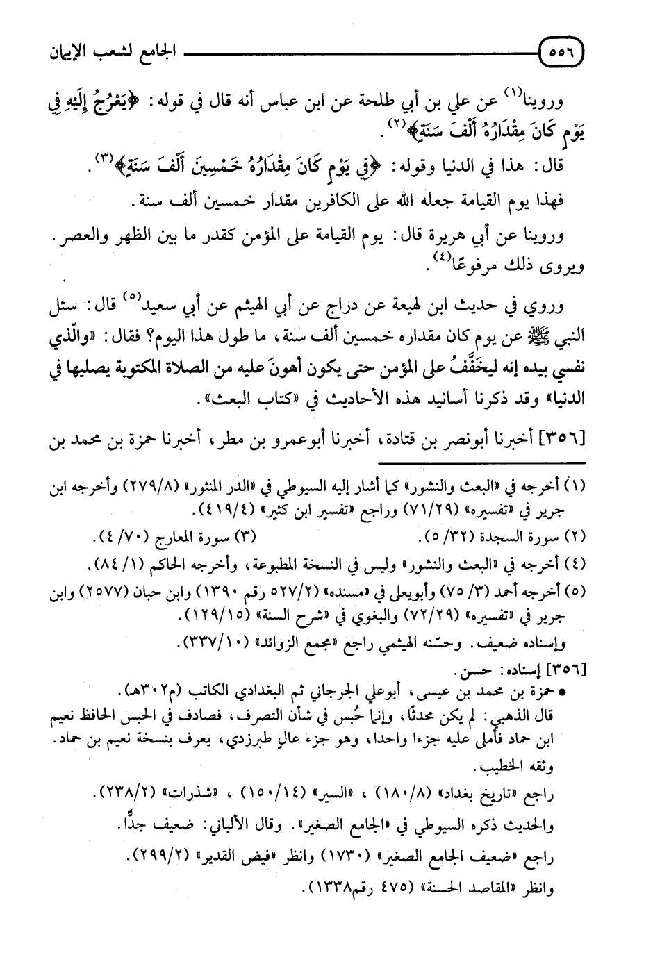 356 - أَخْبَرَنَا أَبُو نَصْرِ بْنُ قَتَادَةَ، أَخْبَرَنَا أَبُو عَمْرِو بْنُ مَطَرٍ، أَخْبَرَنَا حَمْزَةُ بْنُ مُحَمَّدِ بْنِ -[557]- عِيسَى الْكَاتِبُ، أَخْبَرَنَا نُعَيْمُ بْنُ حَمَّادٍ، حدثنا ابْنُ الْمُبَارَكِ، عَنْ مَعْمَرٍ، عَنْ هَمَّامِ بْنِ مُنَبِّهٍ، عَنْ أَبِي هُرَيْرَةَ، أَظُنُّهُ رَفَعَهُ إِلَى النَّبِيِّ صَلَّى اللَّهُ عَلَيْهِ وَسَلَّمَ قَالَ: " إِنَّ §اللهَ يُخَفِّفُ عَلَى مَنْ يَشَاءُ مِنْ عِبَادِهِ طُولَ يَوْمِ الْقِيَامَةِ كَوَقْتِ صَلَاةٍ مَكْتُوبَةٍ " قَالَ الْبَيْهَقِيُّ رَحِمَهُ اللهُ: " هَذَا وَجَدْتُهُ فِي فَوَائِدَ أَبِي عَمْرٍو، وَلَا أَدْرِي مَنِ الْقَائِلِ أَظُنُّهُ " وَكَذَلِكَ رَوَاهُ أَبُو سَهْلٍ الْإِسْفَرَايِينِيُّ، عَنْ حَمْزَةَ