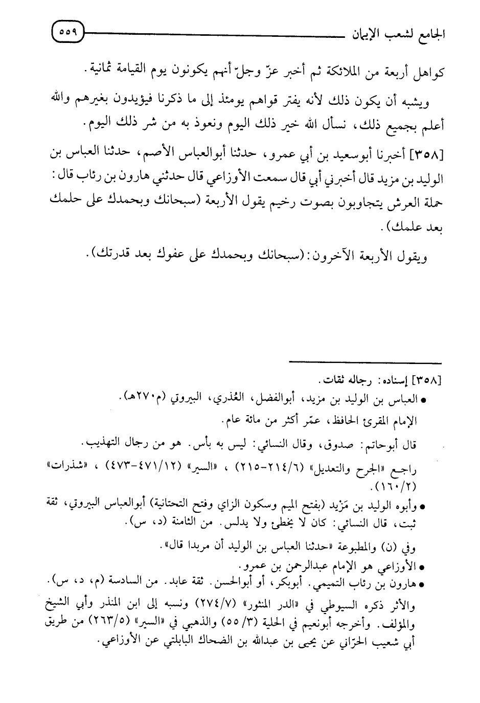 358 - أَخْبَرَنَا أَبُو سَعِيدِ بْنُ أَبِي عَمْرٍو، حدثنا أَبُو الْعَبَّاسِ الْأَصَمُّ، حدثنا الْعَبَّاسُ بْنُ الْوَلِيدِ بْنِ مَزْيَدَ قَالَ: أَخْبَرَنِي أَبِي قَالَ: سَمِعْتُ الْأَوْزَاعِيَّ قَالَ: حَدَّثَنِي هَارُونُ بْنُ رِيابٍ قَالَ: " §حَمَلَةُ الْعَرْشِ يَتَجَاوَبُونَ بِصَوْتٍ حَسَنٍ رَخِيمٍ يَقُولُ الْأَرْبَعَةُ: سُبْحَانَكَ وَبِحَمْدِكَ عَلَى حِلْمِكَ بَعْدَ عِلْمِكَ، وَيَقُولُ الْأَرْبَعَةُ الْآخَرُونَ: سُبْحَانَكَ وَبِحَمْدِكَ عَلَى عَفْوِكَ بَعْدَ قُدْرَتِكَ "