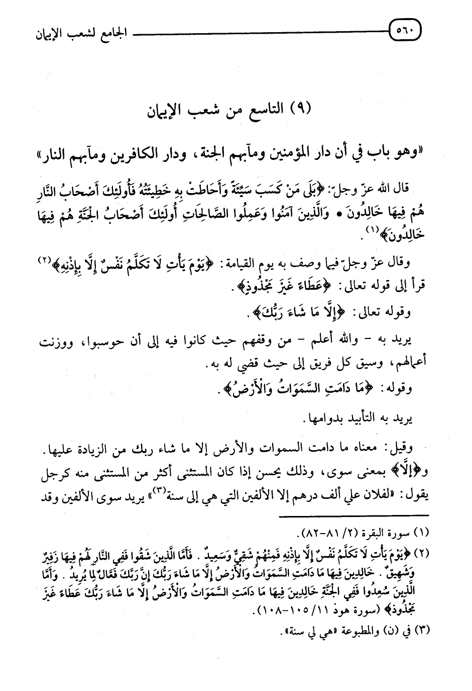 §التَّاسِعُ مِنْ شُعَبِ الْإِيمَانِ، وَهُوَ بَابٌ فِي أَنَّ دَارَ الْمُؤْمِنِينَ، وَمَآبهُمُ الْجَنَّةُ وَدَارَ الْكَافِرِينَ وَمَآبَهُمُ النَّارُ " قَالَ اللهُ عَزَّ وَجَلَّ: {بَلَى مَنْ كَسَبَ سَيِّئَةً، وَأَحَاطَتْ بِهِ خَطِيئَتُهُ فَأُولَئِكَ أَصْحَابُ النَّارِ هُمْ فِيهَا خَالِدُونَ، وَالَّذِينَ آمَنُوا وَعَمِلُوا الصَّالِحَاتِ أُولَئِكَ أَصْحَابُ الْجَنَّةِ هُمْ فِيهَا خَالِدُونَ} [البقرة: 82] وَقَالَ عَزَّ وَجَلَّ: فِيمَا وَصَفَ بِهِ يَوْمَ الْقِيَامَةِ: {يَوْمَ يَأْتِ لَا تَكَلَّمُ نَفْسٌ إِلَّا بِإِذْنِهِ} [هود: 105] قَرَأَ إِلَى قَوْلِهِ تَعَالَى: {عَطَاءً غَيْرَ مَجْذُوذٍ} [هود: 108]، وَقَوْلُهُ تَعَالَى: {إِلَّا مَا شَاءَ رَبُّكَ} [هود: 107] يُرِيدُ بِهِ وَاللهُ أَعْلَمُ مِنْ وَقْفِهِمْ حَيْثُ كَانُوا فِيهِ إِلَى أَنْ حُوسِبُوا وَوُزِنَتْ أَعْمَالُهُمْ، وَسِيقَ كُلُّ فَرِيقٍ إِلَى حَيْثُ قُضِيَ لَهُ بِهِ، وَقَوْلُهُ: {مَا دَامَتِ السَّمَوَاتُ وَالْأَرْضُ} يُرِيدُ بِهِ التَّأْبِيدَ بِدَوَامِهَا، وَقِيلَ: مَعْنَاهُ مَا دَامَتِ السَّمَاوَاتُ وَالْأَرْضُ إِلَّا مَا شَاءَ رَبُّكَ مِنَ الزِّيَادَةِ عَلَيْهَا، وَإِلَّا بِمَعْنَى سِوَى وَذَلِكَ يَحْسُنُ إِذَا كَانَ الْمُسْتَثْنَى أَكْثَرَ مِنَ الْمُسْتَثْنَى مِنْهُ كَرَجُلٍ يَقُولُ: لِفُلَانٍ عَلَيَّ أَلْفُ دِرْهَمٍ إِلَّا الألْفَيْنِ الَّتِي هِيَ إِلَى سَنَةٍ يُرِيدُ سِوَى الْأَلْفَيْنِ، وَقَدْ
