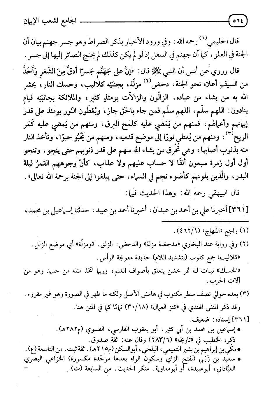 قَالَ: وَرُوِي عَنْ أَنَسٍ، أَنَّ النَّبِيَّ صَلَّى اللَّهُ عَلَيْهِ وَسَلَّمَ قَالَ: §" إِنَّ عَلَى جَهَنَّمَ جِسْرًا أَدَقَّ مِنَ الشَّعْرِ وأحد مِنَ السَّيْفِ أَعْلَاهُ نَحْوَ الْجَنَّةِ دَحْضٌ مَزِلَّةٌ بِجَنْبَيْهِ كَلَالِيبُ، وَحَسَكُ النَّارِ يَحْبِسُ اللهُ بِهِ مَنْ يَشَاءُ مِنْ عِبَادِهِ الزَّالُّونَ وَالزَّالَّاتُ يَوْمَئِذٍ كَثِيرٌ، وَالْمَلَائِكَةُ بِجَانِبَيْهِ قِيَامٌ يُنَادُونَ اللهُمَّ سَلِّمْ، اللهُمَّ سَلِّمْ فَمَنْ جَاءَ بِالْحَقِّ جَازَ، وَيُعْطَوُنَ النُّورَ يَوْمَئِذٍ عَلَى قَدْرِ إِيمَانِهِمْ، وَأَعْمَالِهِمْ فَمِنْهُمْ مَنْ يَمْضِي عَلَيْهِ كَلَمْحِ الْبَرْقِ، وَمِنْهُمْ مَنْ يَمْضِي عَلَيْهِ كَمَرِّ الرِّيحِ، وَمِنْهُمْ مَنْ يُعْطَى نُورًا إِلَى مَوْضِعِ قَدَمَيْهِ، وَمِنْهُمْ مَنْ يَحْبُو حَبْوًا، وَتَأْخُذُ النَّارُ مِنْهُ بِذُنُوبٍ أَصَابَهَا، وَهِيَ تَحْرِقُ مَنْ يَشَاءُ اللهُ مِنْهُمْ عَلَى قَدْرِ ذُنُوبِهِمْ حَتَّى ينْجُوَ وَتَنْجُوَ أَوَّلَ أَوَّلَ زُمْرَةٍ سَبْعُونَ أَلْفًا لَا حِسَابَ عَلَيْهِمْ وَلَا عَذَابَ كَأَنَّ وُجُوهَهُمُ الْقَمَرُ لَيْلَةَ الْبَدْرِ، وَالَّذِينَ يَلُونَهُمْ كَأَضٍوَاءِ نَجْمٍ فِي السَّمَاءِ حَتَّى يَبْلُغُوا إِلَى الْجَنَّةِ بِرَحْمَةِ اللهِ تَعَالَى " قَالَ الْبَيْهَقِيُّ رَحِمَهُ اللهُ: وَهَذَا الْحَدِيثُ فِيمَا