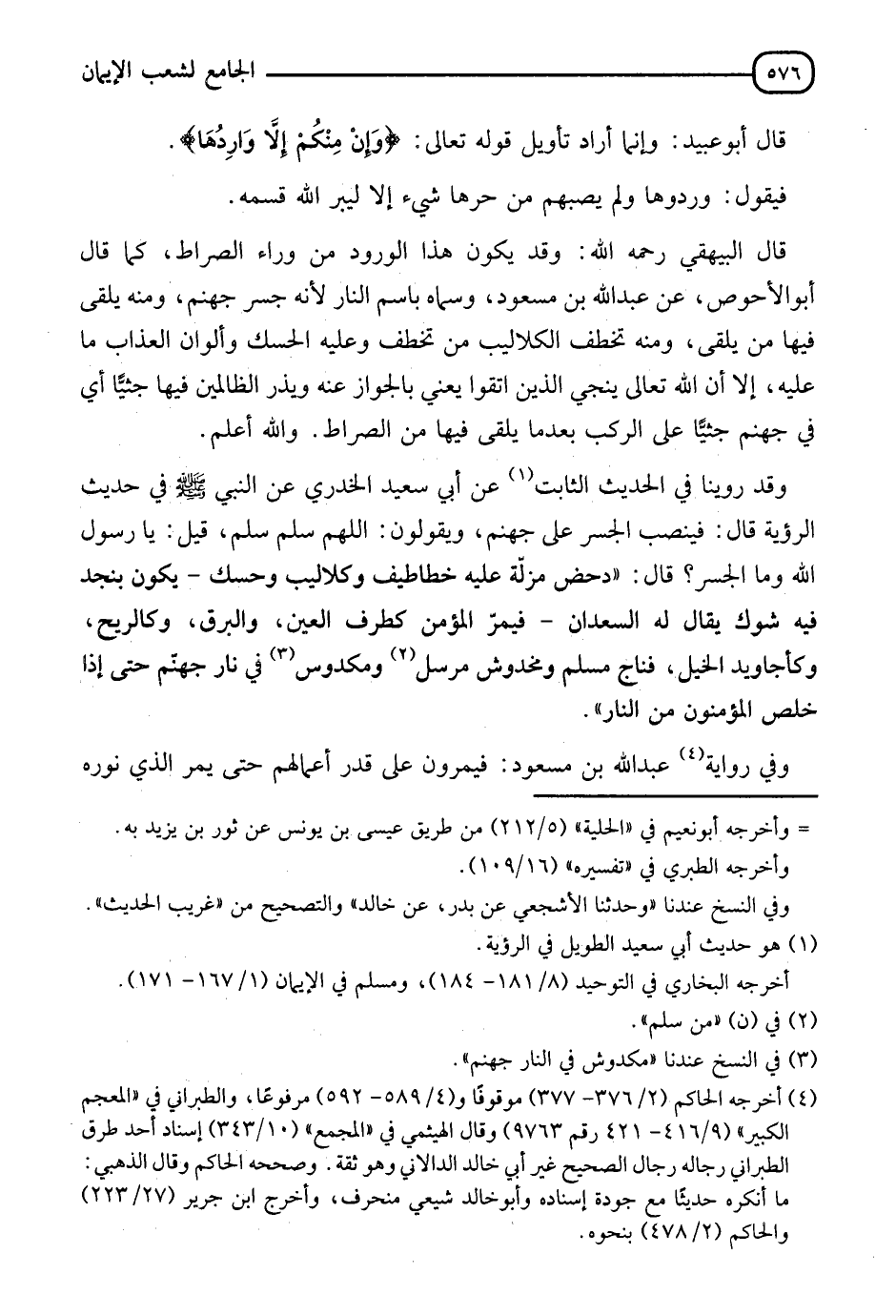 قَالَ أَبُو عُبَيْدٍ: " وَإِنَّمَا أَرَادَ تَأْوِيلَ قَوْلِهِ تَعَالَى: {وَإِنْ مِنْكُمْ إِلَّا وَارِدُهَا} [مريم: 71] فَيَقُولُ: وُرُودُهَا وَلَمْ يُصِبْهُمْ مِنْ حَرِّهَا شَيْءٌ إِلَّا لِيُبِرَّ اللهُ قَسَمَهُ " قَالَ الْبَيْهَقِيُّ رَحِمَهُ اللهُ: " وَقَدْ يَكُونُ هَذَا الْورُودُ مِنْ وَرَاءِ الصِّرَاطِ " كَمَا: قَالَ أَبُو الْأَحْوَصِ، عَنْ عَبْدِ اللهِ بْنِ مَسْعُودٍ " وَسَمَّاهُ بِاسْمِ النَّارِ لِأَنَّهُ جِسْرُ جَهَنَّمَ، وَمِنْهُ يُلْقَى فِيهَا مَنْ يُلْقَى، وَمِنْهُ تَخْطَفُ الْكَلَالِيبُ مَنْ تَخْطَفُ وَعَلَيْهِ الْحَسَكُ وَأَلْوَانُ الْعَذَابِ مَا عَلَيْهِ إِلَّا أَنَّ اللهَ تَعَالَى يُنَجِّي الَّذِينَ اتَّقَوْا يَعْنِي بِالْجَوَازِ عَنْهُ، وَيَذَرُ الظَّالِمِينَ فِيهَا جِثِيًّا أَيْ فِي جَهَنَّمَ جِثِيًّا عَلَى الرُّكَبِ بَعْدَمَا يُلْقِي فِيهَا مِنَ الصِّرَاطِ وَاللهُ أَعْلَمُ "