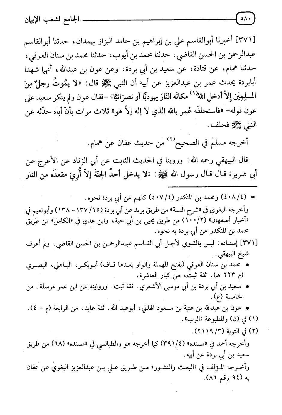 371 - أَخْبَرَنَا أَبُو الْقَاسِمِ عَلِيُّ بْنُ إِبْرَاهِيمَ بْنِ حَامِدٍ الْبَزَّازُ بِهَمْدَانَ، حدثنا أَبُو الْقَاسِمِ عَبْدُ الرَّحْمَنِ بْنُ الْحَسَنِ الْقَاضِي، حدثنا مُحَمَّدُ بْنُ أَيُّوبَ، حدثنا مُحَمَّدُ بْنُ سِنَانٍ الْعَوَقِيُّ، حدثنا هَمَّامٌ، عَنْ قَتَادَةَ، عَنْ سَعِيدِ بْنِ أَبِي بُرْدَةَ، وَعَنْ عَوْنِ بْنِ عَبْدِ اللهِ، أَنَّهُمَا شَهِدَا أَبَا بُرْدَةَ يُحَدِّثُ عُمَرَ بْنَ عَبْدِ الْعَزِيزِ، عَنْ أَبِيهِ، أَنَّ النَّبِيَّ صَلَّى اللَّهُ عَلَيْهِ وَسَلَّمَ قَالَ: §" لَا يَمُوتُ رَجُلٌ من المُسْلِمين إِلَّا أَدْخَلَ اللهُ مَكَانَهُ النَّارَ يَهُودِيًّا أَوْ نَصْرَانِيًّا " فَقَالَ عَوْنٌ: " وَلَمْ يُنْكِرْ سَعِيدٌ عَلَى عَوْنٍ قَوْلَهُ فَاسْتَحْلَفَهُ عُمَرُ بِاللهِ الَّذِي لَا إِلَهَ إِلَّا هُوَ ثَلَاثَ مَرَّاتٍ بِأَنَّ أَبَاهُ حَدَّثَهُ، عَنِ النَّبِيِّ صَلَّى اللَّهُ عَلَيْهِ وَسَلَّمَ فَحَلَفَ " أَخْرَجَهُ مُسْلِمٌ فِي الصَّحِيحِ، مِنْ حَدِيثِ عَفَّانَ، عَنْ هَمَّامٍ قَالَ الْبَيْهَقِيُّ رَحِمَهُ اللهِ: وَرُوِّينَا فِي الْحَدِيثِ الثَّابِتِ