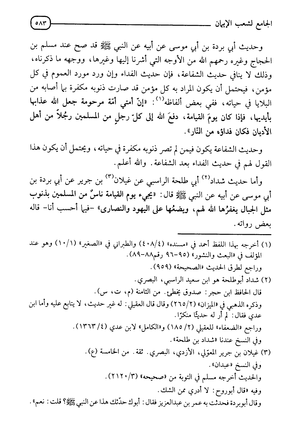 شَدَّادٍ أَبِي طَلْحَةَ الرَّاسِبِيِّ، عَنْ غَيْلَانَ بْنِ جَرِيرٍ، عَنْ أَبِي بُرْدَةَ بْنِ أَبِي مُوسَى، عَنْ أَبِيهِ، عَنِ النَّبِيِّ صَلَّى اللَّهُ عَلَيْهِ وَسَلَّمَ قَالَ: §" يَجِيءُ يَوْمَ الْقِيَامَةِ نَاسٌ مِنَ الْمُسْلِمِينَ بِذُنُوبٍ مِثْلِ الْجِبَالِ يَغْفِرُهَا اللهُ لَهُمْ وَيَضَعُهَا عَلَى الْيَهُودِ وَالنَّصَارَى " " فِيمَا أَحْسِبُ أَنَا قَالَهُ بَعْضُ رُوَاتِهِ، -[584]- فَهَذَا حَدِيثٌ شَكٌّ فِيهِ رَاوِيهِ، وَشَدَّادُ أَبُو طَلْحَةَ مِمَّنْ تَكَلَّمَ أَهْلُ الْعِلْمِ بِالْحَدِيثِ فِيهِ، وَإِنْ كَانَ مُسْلِمُ بْنُ الْحَجَّاجِ اسْتَشْهَدَ بِهِ فِي كِتَابِهِ فَلَيْسَ هُوَ مِمَنْ يُقْبَلُ مِنْهُ مَا يُخَالِفُ فِيهِ كيف، وَالَّذِينَ خَالَفُوهُ فِي لَفْظِ الْحَدِيثِ عَدَدٌ وَهُوَ وَاحِدٌ، وَكُلُّ وَاحِدٍ مِمَّنْ خَالَفَهُ أَحْفَظُ مِنْهُ فَلَا مَعْنَى لِلِاشْتِغَالِ بِتَأْوِيلِ مَا رَوَاهُ مَعَ خِلَافِ ظَاهِرِ مَا رَوَاهُ الْأُصُولَ الصَّحِيحَةَ الْمُمَهَّدَةَ فِي: {أَلَّا تَزِرَ وَازِرَةٌ وِزْرَ أُخْرَى} [النجم: 38] وَاللهُ أَعْلَمُ "