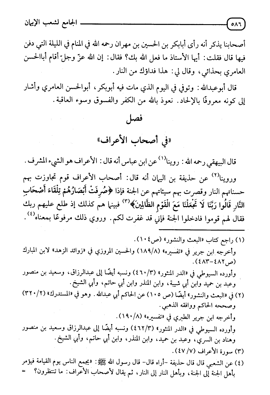 §فَصْلٌ فِي أَصْحَابِ الْأَعْرَافِ قَالَ الْبَيْهَقِيُّ رَحِمَهُ اللهُ: رُوِّينَا عَنِ ابْنِ عَبَّاسٍ أَنَّهُ قَالَ: " الْأَعْرَافُ: هُوَ الشَّيْءُ الْمُشْرِفُ " وَرُوِّينَا عَنْ حُذَيْفَةَ بْنِ الْيَمَانِ أَنَّهُ قَالَ: " أَصْحَابُ الْأَعْرَافِ: قَوْمٌ تَجَاوَزَتْ بِهِمْ حَسَنَاتُهُمُ النَّارَ، وَقَصُرَتْ بِهِمْ سَيِّئَاتُهُمْ عَنِ الْجَنَّةِ، فَإِذَا صُرِفَتْ أَبْصَارُهُمْ تِلْقَاءَ أَصْحَابِ النَّارِ قَالُوا: رَبَّنَا لَا تَجْعَلْنَا مَعَ الْقَوْمِ الظَّالِمِينَ فَبَيْنَمَا هُمْ كَذَلِكَ إِذْ طَلَعَ عَلَيْهِمْ رَبُّكَ فَقَالَ لَهُمْ: قُومُوا فَادْخُلُوا الْجَنَّةَ فَإِنِّي قَدْ غَفَرْتُ لَكُمْ " " وَرُوِيَ ذَلِكَ مَرْفُوعًا بِمَعْنَاهُ "