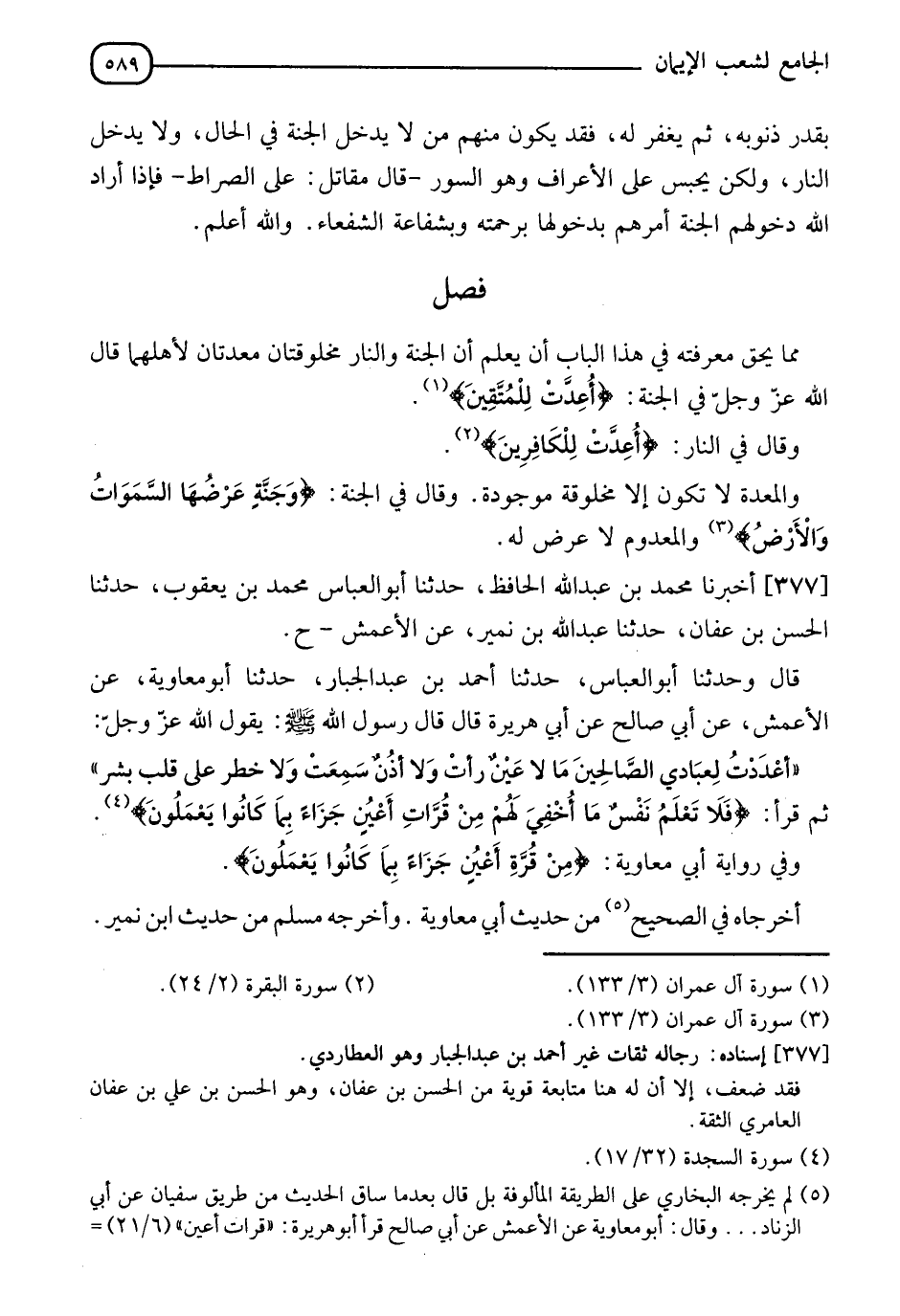 §فَصْلٌ " مِمَّا يَحِقُّ مَعْرِفَتُهُ فِي هَذَا الْبَابِ أَنْ يعْلَمَ أَنَّ الْجَنَّةَ وَالنَّارَ مَخْلُوقَتَانِ مُعَدَّتَانِ لِأَهْلِهِمَا، قَالَ اللهُ عَزَّ وَجَلَّ فِي الْجَنَّةِ: {أُعِدَّتْ لِلْمُتَّقِينَ} [آل عمران: 133]، وَقَالَ فِي النَّارِ: {أُعِدَّتِ لِلْكَافِرِينَ} [البقرة: 24] وَالْمُعَدَّةُ لَا تَكُونُ إِلَّا مَخْلُوقَةً مَوْجُودَةً، وَقَالَ فِي الْجَنَّةِ: {وَجَنَّةِ عَرْضُهَا السَّمَوَاتُ وَالْأَرْضُ}، وَالْمَعْدُومُ لَا عَرْضَ لَهُ "