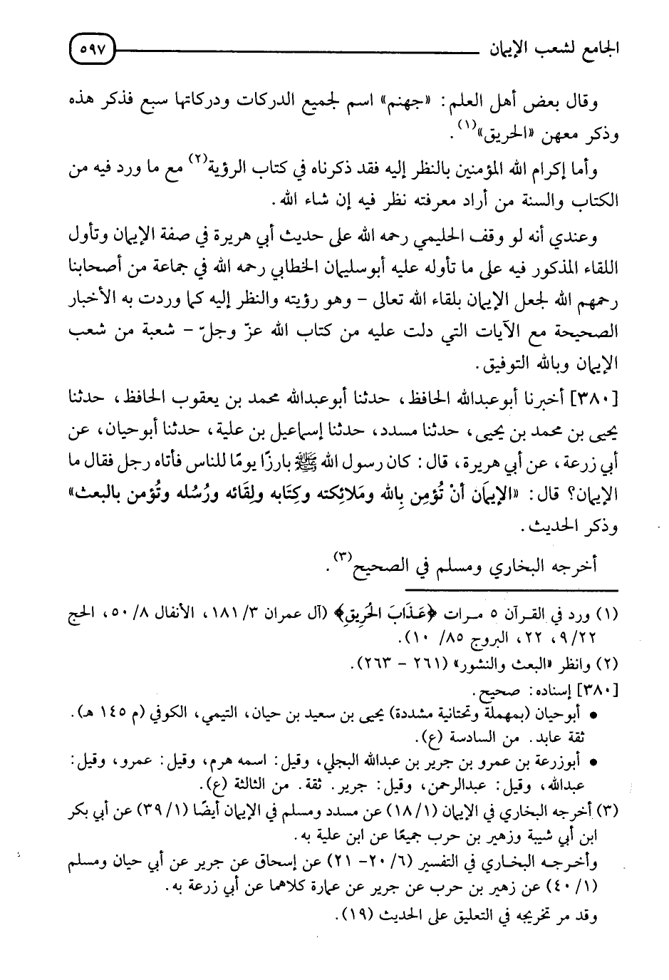 380 - أَخْبَرَنَا أَبُو عَبْدِ اللهِ الْحَافِظُ، حدثنا أَبُو عَبْدِ اللهِ مُحَمَّدُ بْنُ يَعْقُوبَ الْحَافِظُ، حدثنا يَحْيَى بْنُ مُحَمَّدِ بْنِ يَحْيَى، حدثنا مُسَدَّدٌ، حدثنا إِسْمَاعِيلُ بْنُ عُلَيَّةَ، حدثنا أَبُو حَيَّانَ، عَنْ أَبِي زُرْعَةَ، عَنْ أَبِي هُرَيْرَةَ قَالَ: كَانَ رَسُولُ اللهِ صَلَّى اللَّهُ عَلَيْهِ وَسَلَّمَ بَارِزًا يَوْمًا لِلنَّاسِ فَأَتَاهُ رَجُلٌ فَقَالَ: مَا الْإِيمَانُ؟ قَالَ: " §الْإِيمَانُ أَنْ تُؤْمِنَ بِاللهِ وَمَلَائِكَتِهِ، وَكِتَابِهِ وَلِقَائِهِ وَرُسُلِهِ، وَتُؤْمِنَ بِالْبَعْثِ " وَذَكَرَ الْحَدِيثَ أَخْرَجَهُ الْبُخَارِيُّ، وَمُسْلِمٌ فِي الصَّحِيحِ -[598]- قَالَ أَبُو سُلَيْمَانَ: " قَوْلُهُ: أَنْ تُؤْمِنَ بِلِقَائِهِ فِيهِ إِثْبَاتُ رُؤْيَةِ اللهِ عَزَّ وَجَلَّ فِي الدَّارِ الْآخِرَةِ "