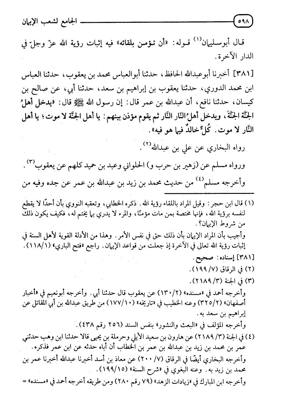 381 - أَخْبَرَنَا أَبُو عَبْدِ اللهِ الْحَافِظُ، حدثنا أَبُو الْعَبَّاسِ مُحَمَّدُ بْنُ يَعْقُوبَ حدثنا الْعَبَّاسُ بْنُ مُحَمَّدٍ الدُّورِيُّ، حدثنا يَعْقُوبُ بْنُ إِبْرَاهِيمَ بْنِ سَعْدٍ، حدثنا أَبِي، عَنْ صَالِحِ بْنِ كَيْسَانَ، حدثنا نَافِعٌ، أَنَّ عَبْدَ اللهِ بْنَ عُمَرَ قَالَ: إِنَّ رَسُولَ اللهِ صَلَّى اللَّهُ عَلَيْهِ وَسَلَّمَ قَالَ: " §يَدْخُلُ أَهْلُ الْجَنَّةِ الْجَنَّةَ، وَيَدْخُلُ أَهْلُ النَّارِ النَّارَ، ثُمَّ يَقُومُ مُؤَذِّنٌ بَيْنَهُمْ يَا أَهْلَ الْجَنَّةِ لَا مَوْتَ يَا أَهْلَ النَّارِ لَا مَوْتَ كُلٌّ خَالِدٌ فِيمَا هُوَ فِيهِ " رَوَاهُ الْبُخَارِيُّ، عَنْ عَلِيِّ بْنِ عَبْدِ اللهِ وَرَوَاهُ مُسْلِمٌ عَنْ زُهَيْرِ بِنِ حَرْبٍ وَالْحُلْوَانِيِّ وَعَبْدِ بْنِ حُمَيْدٍ كُلُّهُمْ عَنْ يَعْقُوبَ وَأَخْرَجَهُ مُسْلِمٌ، مِنْ حَدِيثِ مُحَمَّدِ بْنِ زَيْدِ بْنِ عَبْدِ اللهِ بْنِ عُمَرَ، عَنْ جَدِّهِ " وَفِيهِ مِنَ -[599]- الزِّيَادَةُ ذَبْحُ الْمَوْتِ بَيْنَ الْجَنَّةِ وَالنَّارِ، وَقَدْ أَخْرَجْنَاهُ فِي كِتَابِ الْبَعْثِ "
