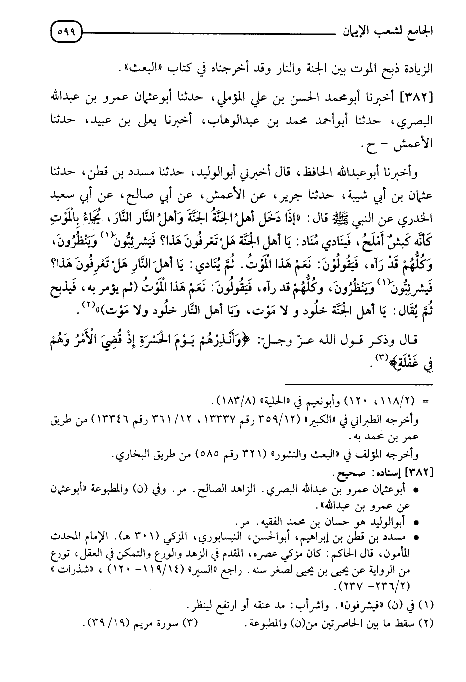 382 - أَخْبَرَنَا أَبُو مُحَمَّدٍ الْحَسَنُ بْنُ عَلِيٍّ الْمُؤَمَّلِيُّ، حدثنا أَبُو عُثْمَانَ عَمْرُو بْنُ عَبْدِ اللهِ الْبَصْرِيُّ، حدثنا أَبُو أَحْمَدَ مُحَمَّدُ بْنُ عَبْدِ الْوَهَّابِ، أَخْبَرَنَا يَعْلَى بْنِ عُبَيْدٍ، حدثنا الْأَعْمَشُ، ح وَأَخْبَرَنَا أَبُو عَبْدِ اللهِ الْحَافِظُ قَالَ: أَخْبَرَنِي أَبُو الْوَلِيدِ، حدثنا مُسَدَّدُ بْنُ قَطَنٍ، حدثنا عُثْمَانُ بْنُ أَبِي شَيْبَةَ، حدثنا جَرِيرٌ، عَنِ الْأَعْمَشِ، عَنْ أَبِي صَالِحٍ، عَنْ أَبِي سَعِيدٍ الْخُدْرِيِّ، عَنِ النَّبِيِّ صَلَّى اللَّهُ عَلَيْهِ وَسَلَّمَ قَالَ: " §إِذَا دَخَلَ أَهْلُ الْجَنَّةِ الْجَنَّةَ، وَأَهْلُ النَّارِ النَّارَ يُجَاءُ بِالْمَوْتِ كَأَنَّهُ كَبْشٌ أَمْلَحُ فَيُنَادِي مُنَادٍ: يَا أَهْلَ الْجَنَّةِ هَلْ تَعْرِفُونَ هَذَا فَيَشْرَئِبُّونَ وَيَنْظُرُونَ، وَكُلُّهُمْ قَدْ رَآهُ فَيَقُولُونَ: نَعَمْ هَذَا الْمَوْتُ، ثم يُنَادَى: يَا أَهْلَ النَّارِ هَلْ تَعْرِفُونَ هَذَا فَيَشْرَئِبُّونَ وَيَنْظُرُونَ وَكُلُّهُمْ قَدْ رَآهُ فَيَقُولُونَ نَعَمْ هَذَا الْمَوْتُ ثُمَّ يُومَرُ بِهِ فَيُذْبَحُ، ثُمَّ يُقَالُ: يَا أَهْلَ الْجَنَّةِ، خُلُودٌ وَلَا مَوْتَ، وَيَا أَهْلَ النَّارِ خُلُودٌ وَلَا مَوْتَ " قَالَ: وَذَكَرَ قَوْلَ اللهِ عَزَّ وَجَلَّ: {وَأَنْذِرْهُمْ يَوْمَ الْحَسْرَةِ إِذْ قُضِيَ الْأَمْرُ وَهُمْ فِي غَفْلَةٍ} [مريم: 39]-[600]- قَالَ: " أَهْلُ الدُّنْيَا فِي غَفْلَةٍ " " لَفْظُ حَدِيثِ يَعْلَى " رَوَاهُ مُسْلِمٌ فِي الصَّحِيحِ، عَنْ عُثْمَانَ بْنِ أَبِي شَيْبَةَ
