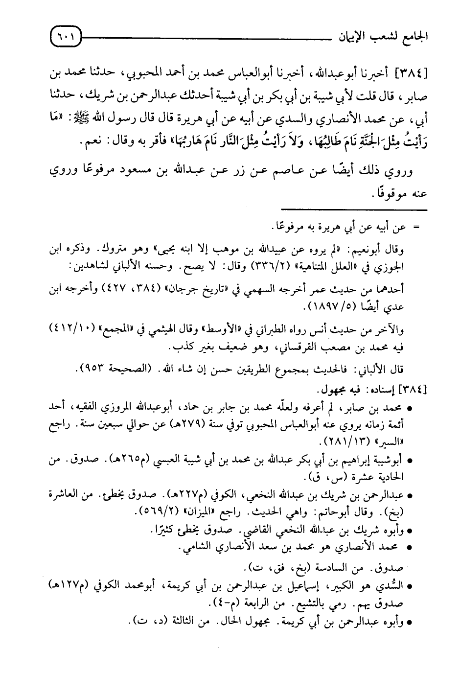 384 - أَخْبَرَنَا أَبُو عَبْدِ اللهِ، أَخْبَرَنَا أَبُو الْعَبَّاسِ مُحَمَّدُ بْنُ أَحْمَدَ الْمَحْبُوبِيُّ، حدثنا مُحَمَّدُ بْنُ صَابِرٍ قَالَ: قُلْتُ لِأَبِي شَيْبَةَ بْنِ أَبِي بَكْرِ بْنِ أَبِي شَيْبَةَ: أَحَدَّثَكَ عَبْدُ الرَّحْمَنِ بْنُ شَرِيكٍ، حدثنا أَبِي، عَنْ مُحَمَّدٍ الْأَنْصَارِيِّ، وَالسُّدِّيِّ، عَنْ أَبِيهِ، عَنْ أَبِي هُرَيْرَةَ قَالَ: قَالَ رَسُولُ اللهِ صَلَّى اللَّهُ عَلَيْهِ وَسَلَّمَ: " §مَا رَأَيْتُ مِثْلَ الْجَنَّةِ نَامَ طَالِبُهَا، وَلَا رَأَيْتُ مِثْلَ النَّارِ نَامَ هَارِبُهَا " فَأَقَرَّ بِهِ وَقَالَ: نَعَمْ وَرُوِيَ ذَلِكَ أَيْضًا، عَنْ عَاصِمٍ، عَنْ زِرٍّ، عَنْ عَبْدِ اللهِ بْنِ مَسْعُودٍ مَرْفُوعًا وَرُوِيَ عَنْهُ مَوْقُوفًا