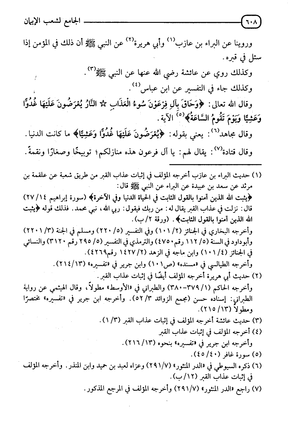 وَرُوِّينَا عَنِ الْبَرَاءِ بْنِ عَازِبٍ، وَأَبِي هُرَيْرَةَ، عَنِ النَّبِيِّ صَلَّى اللَّهُ عَلَيْهِ وَسَلَّمَ أَنَّ ذَلِكَ فِي الْمُؤْمِنِ إِذَا سُئِلَ فِي قَبْرِهِ، وَكَذَلِكَ رُوِيَ عَنْ عَائِشَةَ رَضِيَ اللهُ عَنْهَا، عَنِ النَّبِيِّ صَلَّى اللَّهُ عَلَيْهِ وَسَلَّمَ وَكَذَلِكَ جَاءَ فِي التَّفْسِيرِ عَنِ ابْنِ عَبَّاسٍ وَقَالَ اللهُ تَعَالَى: {وَحَاقَ بِآلِ فِرْعَوْنَ سُوءُ الْعَذَابِ النَّارُ يُعْرَضُونَ عَلَيْهَا غُدُوًّا وَعَشِيًّا وَيَوْمَ تَقُومُ السَّاعَةُ} [غافر: 46] الْآيَةَ " وَقَالَ مُجَاهِدٌ: " يَعْنِي بِقَوْلِهِ {يُعْرَضُونَ عَلَيْهَا غُدُوًّا وَعَشِيًّا} [غافر: 46] مَا كَانَتِ الدُّنْيَا " وَقَالَ قَتَادَةُ: " يُقَالُ لَهُمْ: يَا آلَ فِرْعَوْنَ هَذِهِ مَنَازِلُكُمْ تَوْبِيخًا وَصَغَارًا وَنَقْمَةً،