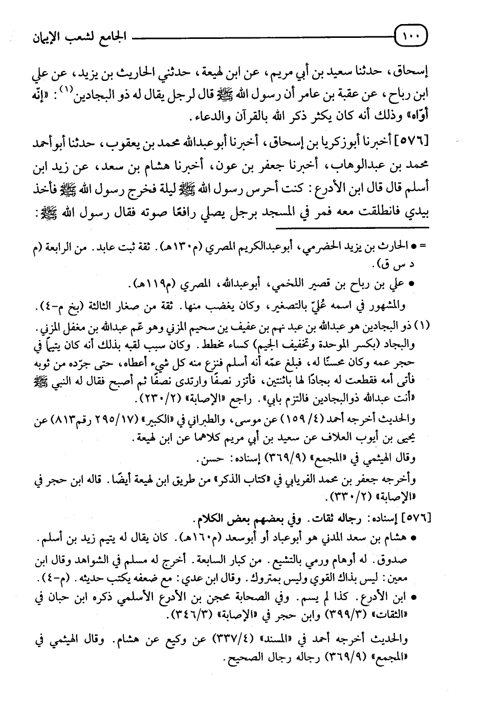 576 - أَخْبَرَنَا أَبُو زَكَرِيَّا بْنُ إِسْحَاقَ، أَخْبَرَنَا أَبُو عَبْدِ اللهِ مُحَمَّدُ بْنُ يَعْقُوبَ، حدثنا أَبُو أَحْمَدَ مُحَمَّدُ بْنُ عَبْدِ الْوَهَّابِ، أَخْبَرَنَا جَعْفَرُ بْنُ عَوْنٍ، أَخْبَرَنَا هِشَامُ بْنُ سَعْدٍ، عَنْ زَيْدِ بْنِ أَسْلَمَ قَالَ: قَالَ ابْنُ الْأَدْرَعِ: كُنْتُ أَحْرُسُ رَسُولَ اللهِ صَلَّى اللَّهُ عَلَيْهِ وَسَلَّمَ لَيْلَةً فَخَرَجَ رَسُولُ اللهِ صَلَّى اللَّهُ عَلَيْهِ وَسَلَّمَ فَأَخَذَ بِيَدِي فَانْطَلَقْتُ مَعَهُ فَمَرَّ فِي الْمَسْجِدِ بِرَجُلٍ يُصَلِّي رَافِعًا صَوْتَهُ فَقَالَ رَسُولُ اللهِ صَلَّى اللَّهُ عَلَيْهِ وَسَلَّمَ: " §-[101]- عَسَى أَنْ يَكُونَ هَذَا مُرَائِيًا " قَالَ: قُلْتُ: يَا رَسُولَ اللهِ رَجُلٌ يُصَلِّي قَالَ: " إِنَّكُمْ لَنْ تُدْرِكُوا هَذَا الْأَمْرَ بِالْمُغَالَبَةِ "، ثُمَّ خَرَجَ لَيْلَةً أُخْرَى فَوَجَدَنِي أَحْرُسُ فَأَخَذَ بِيَدِي فَانْطَلَقْتُ مَعَهُ فَمَرَّ بِرَجُلٍ فِي الْمَسْجِدِ يُصَلِّي رَافِعًا صَوْتَهُ قَالَ: قُلْتُ: يَا رَسُولَ اللهِ، عَسَى أَنْ يَكُونَ هَذَا مُرَائِيًا قَالَ: " وَلَكِنَّهُ أَوَّاهٌ " قَالَ: فَذَهَبْتُ بَعْدَ ذَلِكَ أَنْظُرُ مَنْ هُوَ فَإِذَا هُوَ عَبْدُ اللهِ ذُو النِّجَادَيْنِ بِالنُّونِ قَالَ أَبُو أَحْمَدَ: إِنَّمَا هُوَ الْبِجَادَيْنِ قَالَ الْبَيْهَقِيُّ رَحِمَهُ اللهُ: هُوَ كَمَا قَالَ: وَإِنَّمَا سُمِّيَ بِذَلِكَ لِأَنَّهُ لَمَّا أَسْلَمَ نَزَعَ ثِيَابَهُ فَأَعْطَتْهُ أُمِّهِ بِجَادًا مِنْ شَعْرٍ فَشَقَّهُ اثْنَيْنِ فَاتَّزَرَ بِأَحَدِهِمَا وَارْتَدَى بِالْآخَرِ، وَإِسْنَادُ هَذَا الْحَدِيثِ مُرْسَلٌ وَقَدْ أَخْبَرَنَاهُ عَلِيُّ بْنُ أَحْمَدَ بْنِ عَبْدَانَ، أَخْبَرَنَا أَحْمَدُ بْنُ عُبَيْدٍ، حدثنا مُحَمَّدُ بْنُ غَالِبٍ، حدثنا عُمَرُ بْنُ عَبْدِ الْوَهَّابِ الرِّيَاحِيُّ، حدثنا طَلْحَةُ بْنُ يَحْيَى، عَنْ هِشَامِ بْنِ سَعْدٍ، عَنْ زَيْدِ بْنِ أَسْلَمَ، عَنْ سَلَمَةَ بْنِ الْأَكْوَعِ قَالَ: كُنْتُ أَحْرُسُ رَسُولَ اللهِ صَلَّى اللَّهُ عَلَيْهِ وَسَلَّمَ لَيْلَةً فَذَكَرَ مَعْنَاهُ وَقَالَ فِي آخِرِهِ: فَإِذَا هُوَ عَبْدُ اللهِ ذُو النِّجَادَيْنِ قَالَ الْبَيْهَقِيُّ رَحِمَهُ اللهُ: وَهَذَا لَيْسَ بِشَيْءٍ وَالصَّحِيحُ رِوَايَةُ جَعْفَرِ بْنِ عَوْنٍ