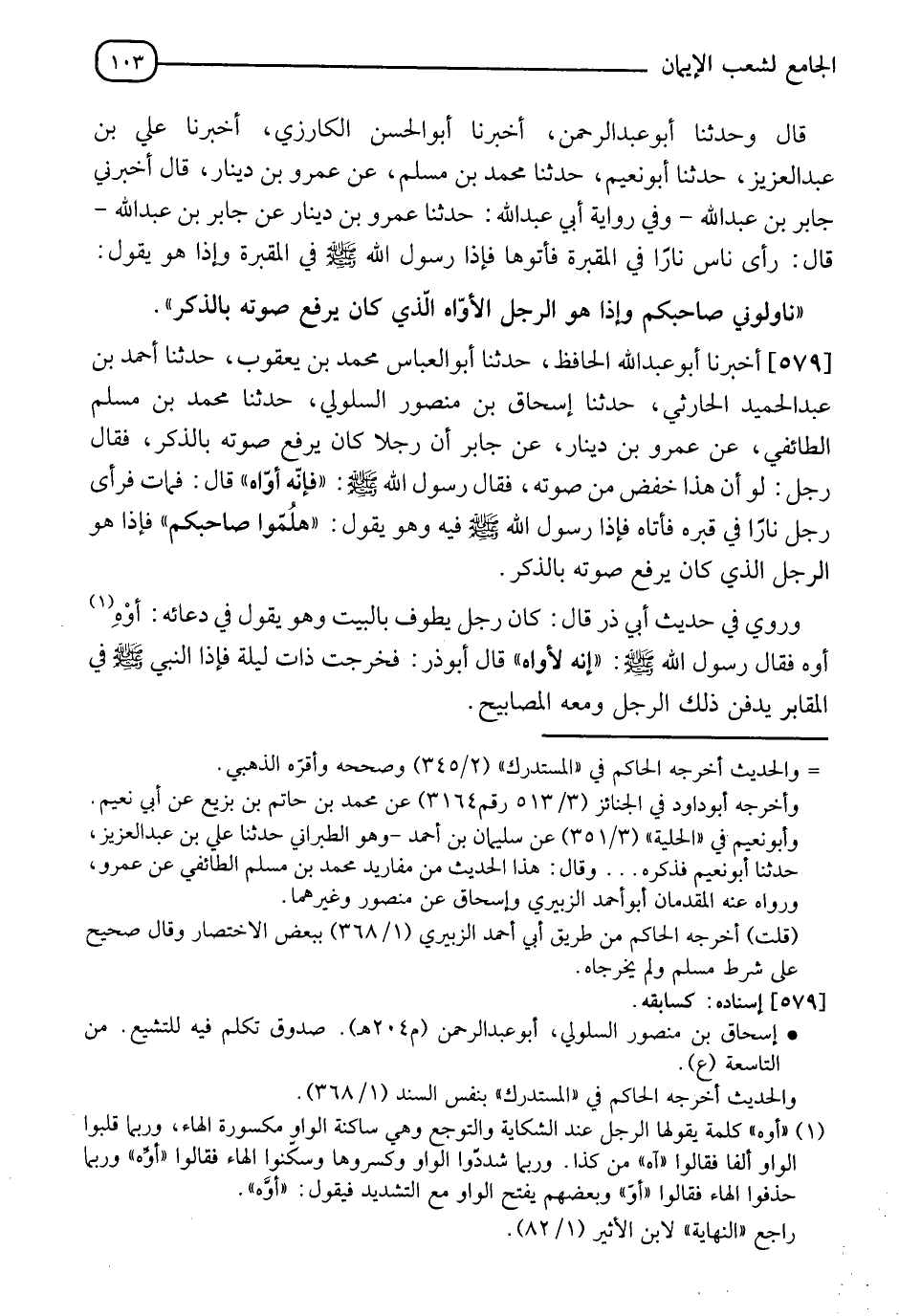 579 - أَخْبَرَنَا أَبُو عَبْدِ اللهِ الْحَافِظُ، حدثنا أَبُو الْعَبَّاسِ مُحَمَّدُ بْنُ يَعْقُوبَ، حدثنا أَحْمَدُ بْنُ عَبْدِ الْحَمِيدِ الْحَارِثِيُّ، حدثنا إِسْحَاقُ بْنُ مَنْصُورٍ السَّلُولِيُّ، حدثنا مُحَمَّدُ بْنُ مُسْلِمٍ الطَّائِفِيُّ، عَنْ عَمْرِو بْنِ دِينَارٍ، عَنْ جَابِرٍ، أَنَّ رَجُلًا كَانَ يَرْفَعُ صَوْتَهُ بِالذِّكْرِ فَقَالَ رَجُلٌ: لَوْ أَنَّ هَذَا خَفَضَ مِنْ صَوْتِهِ فَقَالَ رَسُولُ اللهِ صَلَّى اللَّهُ عَلَيْهِ وَسَلَّمَ: " §فَإِنَّهُ أَوَّاهٌ " قَالَ: فَمَاتَ فَرَأَى رَجُلٌ نَارًا فِي قَبْرِهِ فَأَتَاهُ فَإِذَا رَسُولُ اللهِ صَلَّى اللَّهُ عَلَيْهِ وَسَلَّمَ فِيهِ وَهُوَ يَقُولُ: " هَلُمُّوا صَاحِبَكُمْ " فَإِذَا هُوَ الرَّجُلُ الَّذِي كَانَ يَرْفَعُ صَوْتَهُ بِالذِّكْرِ " وَرُوِيَ فِي حَدِيثِ أَبِي ذَرٍّ قَالَ: كَانَ رَجُلٌ يَطُوفُ بِالْبَيْتِ وَهُوَ يَقُولُ فِي دُعَائِهِ: أَوَّهْ أَوَّهْ، فَقَالَ رَسُولُ اللهِ صَلَّى اللَّهُ عَلَيْهِ وَسَلَّمَ إِنَّهُ لَأَوَّاهٌ قَالَ أَبُو ذَرٍّ: فَخَرَجْتُ ذَاتَ لَيْلَةٍ فَإِذَا النَّبِيُّ صَلَّى اللَّهُ عَلَيْهِ وَسَلَّمَ فِي الْمَقَابِرِ يَدْفِنُ ذَلِكَ الرَّجُلَ وَمَعَهُ الْمَصَابِيحُ -[104]-