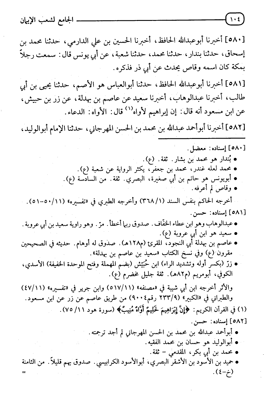 581 - أَخْبَرَنَا أَبُو عَبْدِ اللهِ الْحَافِظُ، حدثنا أَبُو الْعَبَّاسِ هُوَ الْأَصَمُّ، حدثنا يَحْيَى بْنُ أَبِي طَالِبٍ، أَخْبَرَنَا عَبْدُ الْوَهَّابِ، أَخْبَرَنَا سَعِيدٌ، عَنْ عَاصِمِ بْنِ بَهْدَلَةَ، عَنْ زِرِّ بْنِ حُبَيْشٍ، عَنِ ابْنِ مَسْعُودٍ أَنَّهُ قَالَ: إِنَّ " §إِبْرَاهِيمَ لَأَوَّاهٌ قَالَ: الْأَوَّاهُ الدَّعَّاءُ "