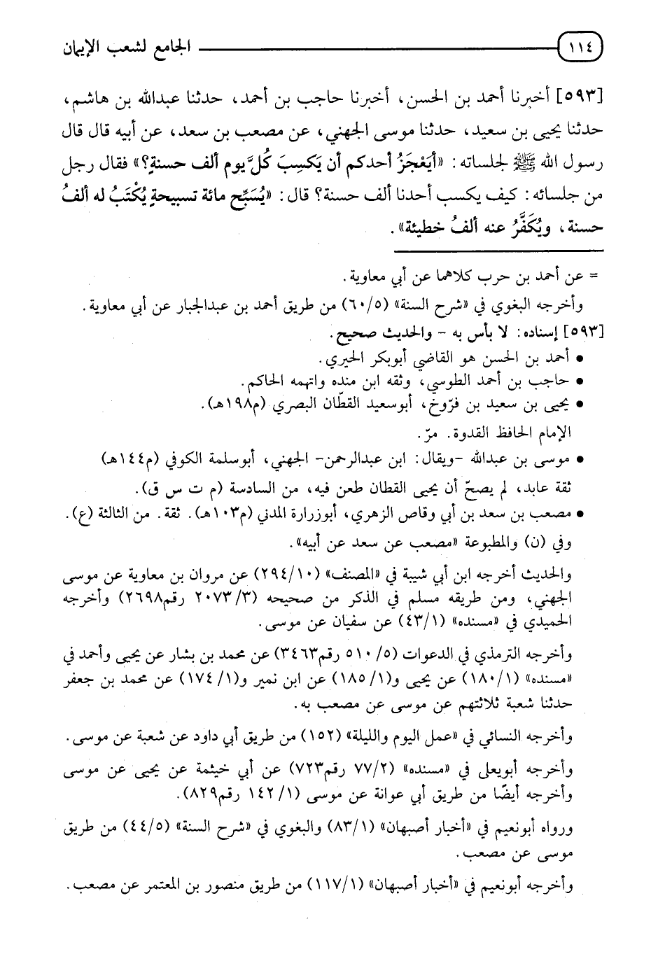 593 - أَخْبَرَنَا أَحْمَدُ بْنُ الْحَسَنِ، أَخْبَرَنَا حَاجِبُ بْنُ أَحْمَدَ، حدثنا عَبْدُ اللهِ بْنُ هَاشِمٍ، حدثنا يَحْيَى بْنُ سَعِيدٍ، حدثنا مُوسَى الْجُهَنِيُّ، عَنْ مُصْعَبِ بْنِ سَعْدٍ، عَنْ أَبِيهِ قَالَ: قَالَ رَسُولُ اللهِ صَلَّى اللَّهُ عَلَيْهِ وَسَلَّمَ لِجُلَسَائِهِ: §" أَيَعْجِزُ أَحَدُكُمْ أَنْ يَكْسِبَ كُلَّ يَوْمٍ أَلْفَ حَسَنَةٍ؟ فَقَالَ رَجُلٌ مِنْ جُلَسَائِهِ: كَيْفَ يَكْسِبُ أَحَدُنَا أَلْفَ حَسَنَةٍ؟ قَالَ: يُسَبِّحُ مِائَةَ تَسْبِيحَةٍ يُكْتَبُ لَهُ أَلْفُ حَسَنَةٍ، وَيُكَفَّرُ عَنْهُ أَلْفُ خَطِيئَةٍ "