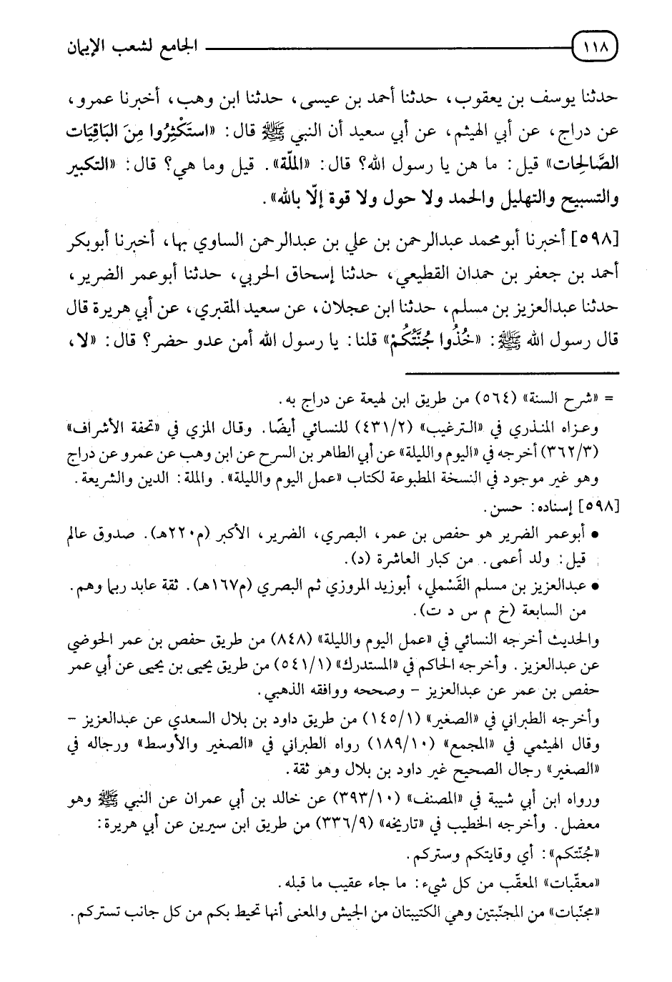 598 - أَخْبَرَنَا أَبُو مُحَمَّدٍ عَبْدُ الرَّحْمَنِ بْنُ عَلِيِّ بْنِ عَبْدِ الرَّحْمَنِ السَّاوِيُّ بها، أَخْبَرَنَا أَبُو بَكْرٍ أَحْمَدُ بْنُ جَعْفَرِ بْنِ حَمْدَانَ الْقَطِيعِيُّ، حدثنا إِسْحَاقُ الْحَرْبِيُّ، حدثنا أَبُو عُمَرَ الضَّرِيرُ، حدثنا عَبْدُ الْعَزِيزِ بْنُ مُسْلِمٍ، حدثنا ابْنُ عَجْلَانَ، عَنْ سَعِيدٍ الْمَقْبُرِيِّ، عَنْ أَبِي هُرَيْرَةَ قَالَ: قَالَ رَسُولُ اللهِ صَلَّى اللَّهُ عَلَيْهِ وَسَلَّمَ: " §خُذُوا جُنَّتَكُمْ قُلْنَا: يَا رَسُولَ اللهِ أَمِنْ عَدُوٍّ حَضَرَ؟ قَالَ: لَا، -[119]- جُنَّتُكُمْ مِنَ النَّارِ قَوْلُ سُبْحَانَ اللهِ وَالْحَمْدُ لِلَّهِ، وَلَا إِلَهَ إِلَّا اللهُ، وَاللهُ أَكْبَرُ يَأْتِينَ يَوْمَ الْقِيَامَةِ مُقَدِّمَاتٍ مُعَقِّبَاتٍ مُجنِبَاتٍ هُنَّ الْبَاقِيَاتُ الصَّالِحَاتُ "