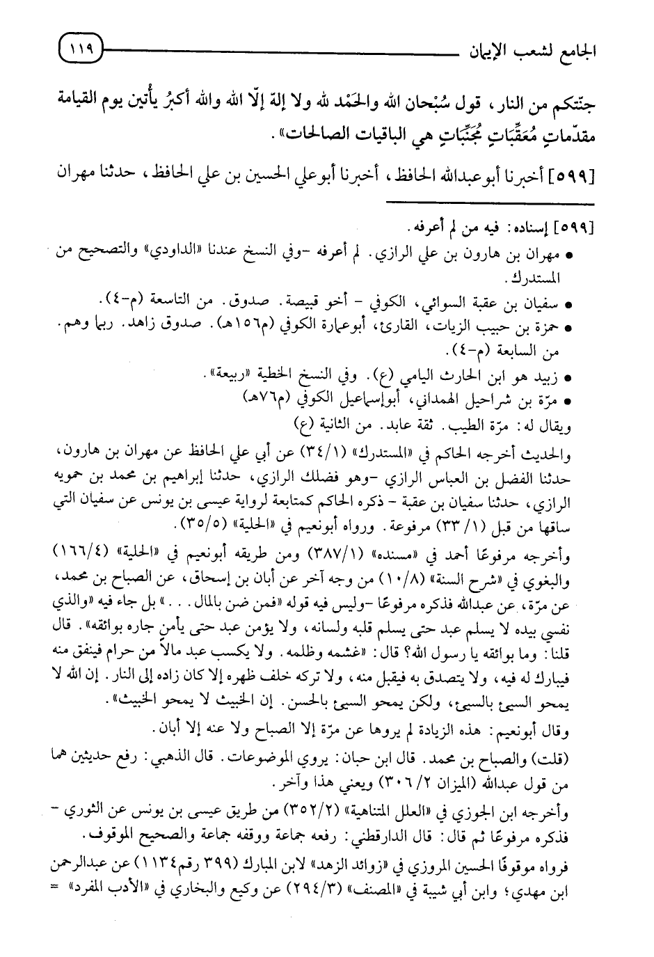 599 - أَخْبَرَنَا أَبُو عَبْدِ اللهِ الْحَافِظُ، أَخْبَرَنَا أَبُو عَلِيٍّ الْحُسَيْنُ بْنُ عَلِيٍّ الْحَافِظُ، حدثنا مِهْرَانُ -[120]- بْنُ هَارُونَ بْنِ عَلِيٍّ الرَّازِيُّ، حدثنا سُفْيَانُ بْنُ عُقْبَةَ أَخُو قَبِيصَةَ، عَنْ حَمْزَةَ الزَّيَّاتِ وَسُفْيَانَ الثَّوْرِيِّ، عَنْ زُبَيْدٍ، عَنْ مُرَّةَ، عَنْ عَبْدِ اللهِ، عَنِ النَّبِيِّ صَلَّى اللَّهُ عَلَيْهِ وَسَلَّمَ أَنَّهُ قَالَ: " §إِنَّ اللهَ قَسَمَ بَيْنَكُمْ أَخْلَاقَكُمْ كَمَا قَسَمَ بَيْنَكُمْ أَرْزَاقَكُمْ، وَإِنَّ اللهَ يُعْطِي الْمَالَ مَنْ يُحِبُّ، وَمَنْ لَا يُحِبُّ، وَلَا يُعْطِي الْإِيمَانَ، إِلَّا مَنْ يُحِبُّ فَإِذَا أَحَبَّ عَبْدًا أَعْطَاهُ الْإِيمَانَ فَمَنَ ضَنَّ بِالْمَالِ أَنْ يُنْفِقَهُ وَهَابَ اللَّيْلَ أَنْ يُكَابِدَهُ، وَخَافَ الْعَدُوَّ أَنْ يُجَاهِدَهُ فَلْيُكْثِرْ مِنْ سُبْحَانَ اللهِ، وَالْحَمْدُ لِلَّهِ وَلَا إِلَهَ إِلَّا اللهُ، وَاللهُ أَكْبَرُ فَإِنَّهُنَّ مُقَدِّمَاتٌ مُجَنِّبَاتٌ، وَمُعَقِّبَاتٌ وَهُنَّ الْبَاقِيَاتُ الصَّالِحَاتُ "