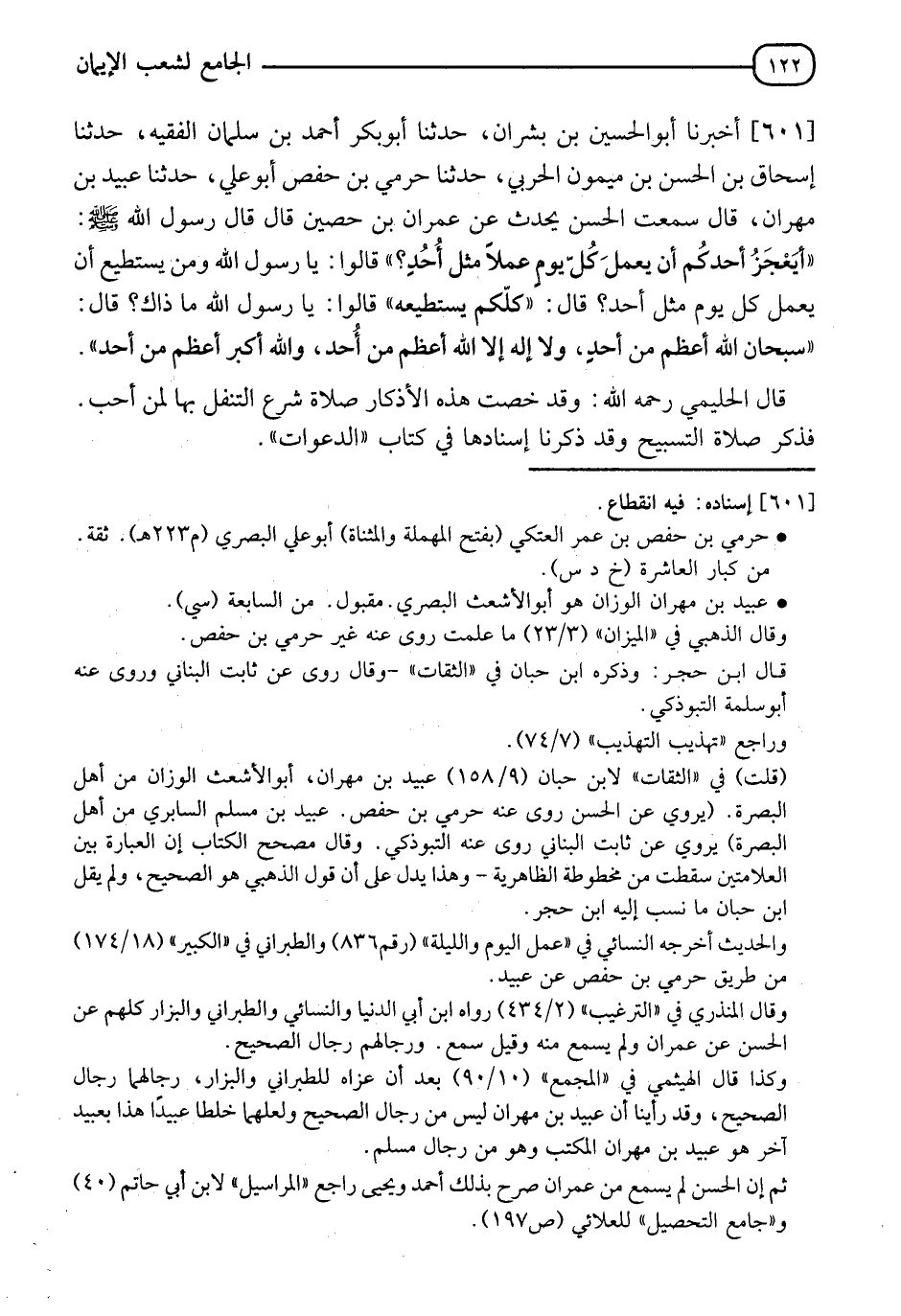 601 - أَخْبَرَنَا أَبُو الْحُسَيْنِ بْنُ بِشْرَانَ، حدثنا أَبُو بَكْرٍ أَحْمَدُ بْنُ سَلْمَانَ الْفَقِيهُ، حدثنا إِسْحَاقُ بْنُ الْحَسَنِ بْنِ مَيْمُونٍ الْحَرْبِيُّ، حدثنا حَرَمِيُّ بْنُ حَفْصٍ أَبُو عَلِيٍّ، حدثنا عُبَيْدُ بْنُ مِهْرَانَ، قَالَ: سَمِعْتُ الْحَسَنَ يُحَدِّثُ، عَنْ عِمْرَانَ بْنِ حُصَيْنٍ قَالَ: قَالَ رَسُولُ اللهِ صَلَّى اللَّهُ عَلَيْهِ وَسَلَّمَ: §" أَيَعْجِزُ أَحَدُكُمْ أَنْ يَعْمَلَ كُلَّ يَوْمٍ عَمَلًا مِثْلَ أُحُدٍ؟ قَالُوا: يَا رَسُولَ اللهِ، وَمَنْ يَسْتَطِيعُ أَنْ يَعْمَلَ كُلَّ يَوْمٍ مِثْلَ أُحُدٍ؟ قَالَ: كُلُّكُمْ يَسْتَطِيعُهُ قَالُوا: يَا رَسُولَ اللهِ مَا ذَاكَ؟ قَالَ: سُبْحَانَ اللهِ أَعْظَمُ مِنْ أُحُدٍ، وَلَا إِلَهَ إِلَّا اللهُ أَعْظَمُ مِنْ أُحُدٍ، وَاللهُ أَكْبَرُ أَعْظَمُ مِنْ أُحُدٍ " قَالَ الْحَلِيمِيُّ رَحِمَهُ اللهُ: وَقَدْ خَصَّتْ هَذِهِ الْأَذْكَارُ صَلَاةً شُرِعَ التَّنَفُّلُ بِهَا لِمَنْ أَحَبَّ فَذَكَرَ صَلَاةَ التَّسْبِيحِ، وَقَدْ ذَكَرْنَا إِسْنَادَهَا فِي كِتَابِ الدَّعَوَاتِ