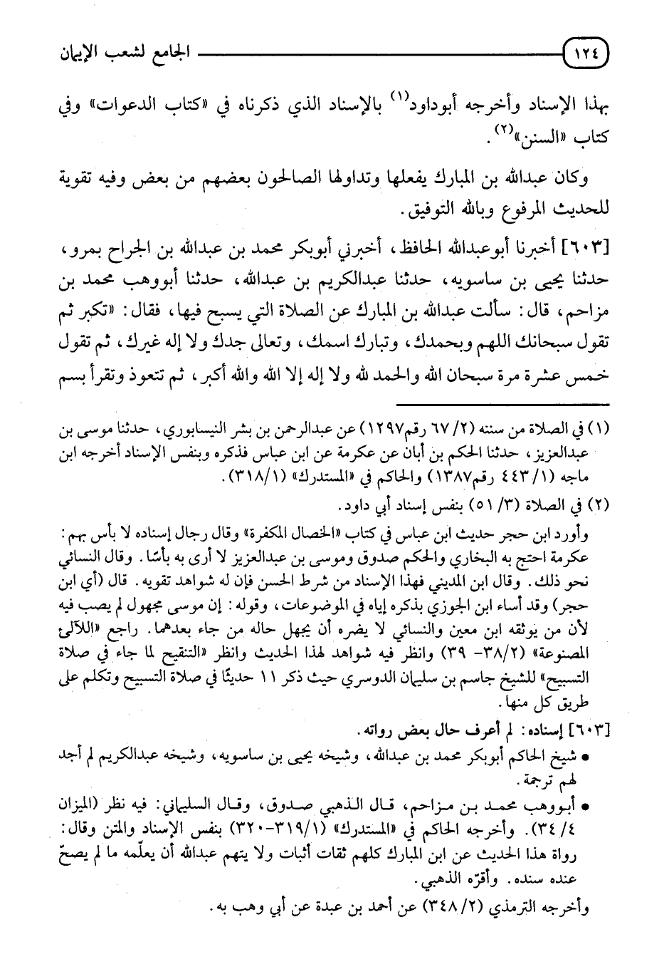 603 - أَخْبَرَنَا أَبُو عَبْدِ اللهِ الْحَافِظُ، أَخْبَرَنِي أَبُو بَكْرٍ مُحَمَّدُ بْنُ عَبْدِ اللهِ بْنِ الْجَرَّاحِ بِمَرْوَ، حدثنا يَحْيَى بْنُ سَاسَوَيْهِ، حدثنا عَبْدُ الْكَرِيمِ بْنُ عَبْدِ اللهِ، حدثنا أَبُو وَهْبٍ مُحَمَّدُ بْنُ مُزَاحِمٍ قَالَ: سَأَلْتُ عَبْدَ اللهِ بْنَ الْمُبَارَكِ، عَنِ الصَّلَاةِ الَّتِي يُسَبَّحُ فِيهَا فَقَالَ: تكَبِّرُ ثُمَّ تقُولُ: " §سُبْحَانَكَ اللهُمَّ وَبِحَمْدِكَ، وَتَبَارَكَ اسْمُكَ، وَتَعَالَى جَدُّكَ، وَلَا إِلَهَ غَيْرُكَ ثُمَّ تقُولُ: خَمْسَ عَشْرَةَ مَرَّةً سُبْحَانَ اللهِ، وَالْحَمْدُ لِلَّهِ وَلَا إِلَهَ إِلَّا اللهُ، وَاللهُ أَكْبَرُ ثُمَّ تتَعَوَّذُ وَتقْرَأُ بِسْمِ -[125]- اللهِ الرَّحْمَنِ الرَّحِيمِ وَفَاتِحَةَ الْكِتَابِ وسورة ثُمَّ تقُولُ: عَشْرَ مَرَّاتٍ سُبْحَانَ اللهِ وَالْحَمْدُ لِلَّهِ، وَلَا إِلَهَ إِلَّا اللهُ وَاللهُ أَكْبَرُ ثُمَّ ترْكَعُ فتقُولُهَا عَشْرًا، ثُمَّ ترْفَعُ رَأْسَكَ فَتقُولُهَا عَشْرًا، ثُمَّ تسْجُدُ فَتقُولُهَا عَشْرًا، ثُمَّ ترْفَعُ رَأْسَكُ فَتقُولُهَا عَشْرًا، ثُمَّ تسْجُدُ الثَّانِيَةَ فتقُولُهَا عَشْرًا، ثُمَّ ترْفَعُ رَأْسَكَ فَتقُولُهَا عَشْرًا، فَصَلِّ أَرْبَعَ رَكَعَاتٍ عَلَى هَذَا فَذَلِكَ خَمْسٌ وَسَبْعُونَ تَسْبِيحَةً فِي كُلِّ رَكْعَةٍ، وَذَلِكَ تَمَامُ الثَّلَاثِمِائَةٍ فَإِنْ صَلَّاهَا لَيْلًا فَأَحَبَّ أَنْ يُسَلِّمَ فِي الرَّكْعَتَيْنِ، وَإِنْ صَلَّاهَا نَهَارًا فَإِنْ شَاءَ سَلَّمَ، وَإِنْ شَاءَ لَمْ يُسَلِّمْ " قَالَ الْبَيْهَقِيُّ رَحِمَهُ اللهُ: هَكَذَا اخْتَارَ ابْنُ الْمُبَارَكِ فِي مَوْضِعِ التَّسْبِيحِ، وَقَوْلُهُ فِي آخِرِهِ " ثُمَّ ترْفَعُ رَأْسَك فتقُولُهَا عَشْرًا " أَظُنُّهَا زِيَادَةً مِنَ الْكَاتِبِ فَإِنَّهَا قَدْ تَمَّتْ خَمْسَةً وَسَبْعِينَ دُونَ ذَلِكَ