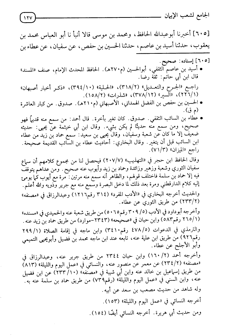 605 - أَخْبَرَنَا أَبُو عَبْدِ اللهِ الْحَافِظُ، وَمُحَمَّدُ بْنُ مُوسَى قَالَا: أنبا الْعَبَّاسِ مُحَمَّدُ بْنُ يَعْقُوبَ، حدثنا أُسَيْدُ بْنُ عَاصِمٍ، حدثنا الْحُسَيْنُ بْنُ حَفْصٍ، عَنْ سُفْيَانَ، عَنْ عَطَاءِ بْنِ -[128]- السَّائِبِ، عَنْ أَبِيهِ، عَنْ عَبْدِ اللهِ بْنِ عَمْرٍو، قَالَ: قَالَ رَسُولُ اللهِ صَلَّى اللَّهُ عَلَيْهِ وَسَلَّمَ: " §خَصْلَتَانِ لَا يُحْصِيهِمَا رَجُلٌ مُسْلِمٌ، إِلَّا دَخَلَ الْجَنَّةَ هُمَا قَلِيلٌ وَمَنْ يَعْمَلُ بِهِمَا قَلِيلٌ قَالُوا: وَمَا هُمَا يَا رَسُولَ اللهِ قَالَ: يُسَبِّحُ اللهَ أَحَدُكُمْ فِي دُبُرِ صَلَاتِهِ عَشْرًا، وَيَحْمَدُ عَشْرًا، وَيُكَبِّرُ عَشْرًا، فَتِلْكَ خَمْسُونَ وَمِائَةٌ بِاللِّسَانِ، وَأَلْفٌ وَخَمْسُمِائَةٍ فِي الْمِيزَانِ، وَإِذَا أَوَى إِلَى فِرَاشِهِ " سَبَّحَ اللهَ وَحَمِدَهُ وَكَبَّرَهُ، مِائَةً فَتِلْكَ مِائَةٌ بِاللِّسَانِ وَأَلْفٌ فِي الْمِيزَانِ فَأَيُّكُمْ يَعْمَلُ فِي الْيَوْمِ، وَاللَّيْلَةِ أَلْفَيْنِ وَخَمْسَمِائَةِ سَيِّئَةٍ " قَالَ: فَرَأَيْتُ رَسُولَ اللهِ صَلَّى اللَّهُ عَلَيْهِ وَسَلَّمَ يَعُدُّهُنَّ بِيَدِهِ قَالُوا: يَا رَسُولَ اللهِ، وَكَيْفَ لَا يُحْصِيهِمَا قَالَ: " يَأْتِي أَحَدَكُمُ الشَّيْطَانُ فَيَقُولُ: اذْكُرْ حَاجَةَ كَذَا، وَحَاجَةَ كَذَا حَتَّى يَنْصَرِفَ، وَلَا يَذْكُرُ وَيَنَامُ وَلَا يَذْكُرُ "