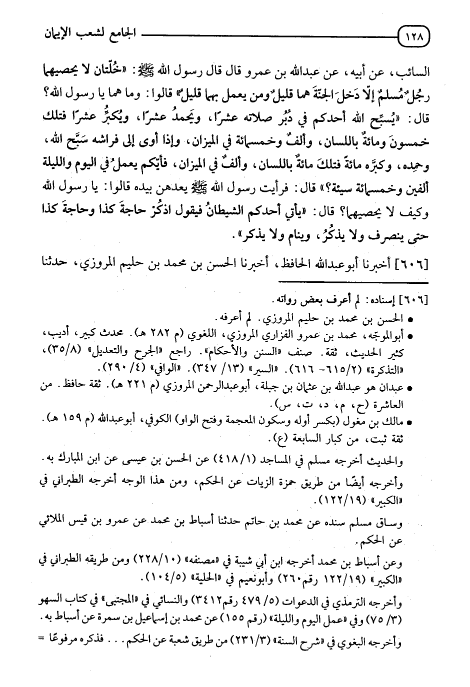 606 - أَخْبَرَنَا أَبُو عَبْدِ اللهِ الْحَافِظُ، أَخْبَرَنَا الْحَسَنُ بْنُ مُحَمَّدِ بْنِ حَلِيمٍ الْمَرْوَزِيُّ، حدثنا -[129]- أَبُو الْمُوَجِّهِ، أَخْبَرَنَا عَبْدَانُ، أَخْبَرَنَا عَبْدُ اللهِ بْنُ الْمُبَارَكِ، حدثنا مَالِكُ بْنُ مِغْوَلٍ قَالَ: سَمِعْتُ الْحَكَمَ بْنَ عُتَيْبَةَ، يُحَدِّثُ عَنْ عَبْدِ الرَّحْمَنِ بْنِ أَبِي لَيْلَى، عَنْ كَعْبِ بْنِ عُجْرَةَ قَالَ: -[130]- قَالَ رَسُولُ اللهِ صَلَّى اللَّهُ عَلَيْهِ وَسَلَّمَ: " §مُعَقِّبَاتٌ لَا يَخِيبُ قَائِلُهُنَّ، أَوْ فَاعِلُهُنَّ دُبُرَ كُلِّ صَلَاةٍ مَكْتُوبَةٍ ثَلَاثًا وَثَلَاثِينَ تَسْبِيحَةً، وَثَلَاثًا وَثَلَاثِينَ تَحْمِيدَةً، وَأَرْبَعًا وَثَلَاثِينَ تَكْبِيرَةً "