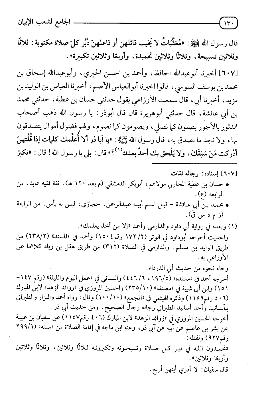 607 - أَخْبَرَنَا أَبُو عَبْدِ اللهِ الْحَافِظُ، وَأَحْمَدُ بْنُ الْحَسَنِ الْحِيرِيُّ، وَأَبُو عَبْدِ اللهِ إِسْحَاقُ بْنُ مُحَمَّدِ بْنِ يُوسُفَ السُّوسِيُّ قَالُوا: أَخْبَرَنَا أَبُو الْعَبَّاسِ الْأَصَمُّ، أَخْبَرَنَا الْعَبَّاسُ بْنُ الْوَلِيدِ بْنِ مَزْيَدَ، أَخْبَرَنَا أَبِي قَالَ: سَمِعْتُ الْأَوْزَاعِيَّ يَقُولُ: حَدَّثَنِي حَسَّانُ بْنُ عَطِيَّةَ، حَدَّثَنِي مُحَمَّدُ بْنُ أَبِي عَائِشَةَ قَالَ: حَدَّثَنِي أَبُو هُرَيْرَةَ قَالَ: قَالَ أَبُو ذَرٍّ: يَا رَسُولَ اللهِ، ذَهَبَ أَصْحَابُ الدُّثُورِ بِالْأُجُورِ يُصَلُّونَ كَمَا نُصَلِّي، وَيَصُومُونَ كَمَا نَصُومُ، وَلَهُمْ فُضُولُ أَمْوَالٍ يَتَصَدَّقُونَ بِهَا، وَلَا نَجِدُ مَا نُصَدِّقُ بِهِ قَالَ رَسُولُ اللهِ صَلَّى اللَّهُ عَلَيْهِ وَسَلَّمَ: يَا أَبَا ذَرٍّ أَلَا أُعَلِّمُكَ كَلِمَاتٍ إِذَا قُلْتَهُنَّ أَدْرَكْتَ مَنْ سَبَقَكَ، وَلَا يَلْحَقُ بِكَ أَحَدٌ بَعْدَكَ؟ قَالَ: بَلَى يَا رَسُولَ اللهِ قَالَ: " §تُكَبِّرُ -[131]- فِي دُبُرِ كُلِّ صَلَاةٍ ثَلَاثًا وَثَلَاثِينَ تَكْبِيرَةً، وَتَحْمَدُ ثَلَاثًا وَثَلَاثِينَ تَحْمِيدَةً، وَتُسَبِّحُ ثَلَاثًا وَثَلَاثِينَ تَسْبِيحَةً، وَتَخْتِمُهَا بِلَا إِلَهَ إِلَّا اللهُ وَحْدَهُ لَا شَرِيكَ لَهُ، لَهُ الْمُلْكُ، وَلَهُ الْحَمْدُ وَهُوَ عَلَى كُلِّ شَيْءٍ قَدِيرٌ " أَخْبَرَنَا أَبُو عَبْدِ اللهِ الْحَافِظُ، وَأَبُو عَبْدِ اللهِ السُّوسِيُّ قَالَا: حدثنا أَبُو الْعَبَّاسِ الْأَصَمُّ، حدثنا سَعِيدُ بْنُ عُثْمَانَ التَّنُوخِيُّ، حدثنا بِشْرُ بْنُ بَكْرٍ، حَدَّثَنِي الْأَوْزَاعِيُّ، بِإِسْنَادِهِ نَحْوَهُ وَكَذَلِكَ رَوَاهُ عَطَاءُ بْنُ يَزِيدَ، عَنْ أَبِي هُرَيْرَةَ: ومِنْ ذَلِكَ الْوَجْهِ أَخْرَجَهُ مُسْلِمٌ فِي الصَّحِيحِ