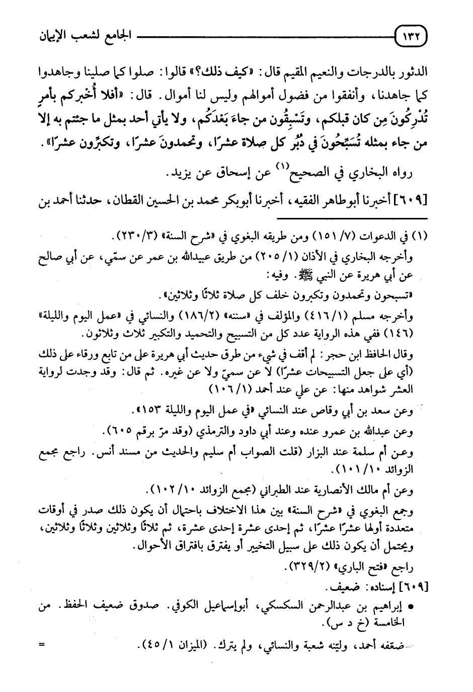 609 - أَخْبَرَنَا أَبُو طَاهِرٍ الْفَقِيهُ، أَخْبَرَنَا أَبُو بَكْرٍ مُحَمَّدُ بْنُ الْحُسَيْنِ الْقَطَّانُ، حدثنا أَحْمَدُ بْنُ -[133]- يُوسُفَ السُّلَمِيُّ، حدثنا عُبَيْدُ اللهِ بْنُ مُوسَى، حدثنا مِسْعَرٌ، عَنْ إِبْرَاهِيمَ السَّكْسَكِيِّ، عَنْ عَبْدِ اللهِ بْنِ أَبِي أَوْفَى، أَنَّ رَجُلًا أَتَى إِلَى النَّبِيِّ صَلَّى اللَّهُ عَلَيْهِ وَسَلَّمَ فَذَكَرَ أَنَّهُ لَا يَسْتَطِيعُ أَنْ يَأْخُذَ مِنَ الْقُرْآنِ شَيْئًا، وَسَأَلَهُ أَنْ يُعَلِّمَهُ شَيْئًا يُجْزِئُ مِنَ الْقُرْآنِ فَقَالَ لَهُ: " §قُلْ سُبْحَانَ اللهِ، وَالْحَمْدُ لِلَّهِ، وَلَا إِلَهَ إِلَّا اللهُ، وَاللهُ أَكْبَرُ وَلَا حَوْلَ، وَلَا قُوَّةَ إِلَّا بِاللهِ "