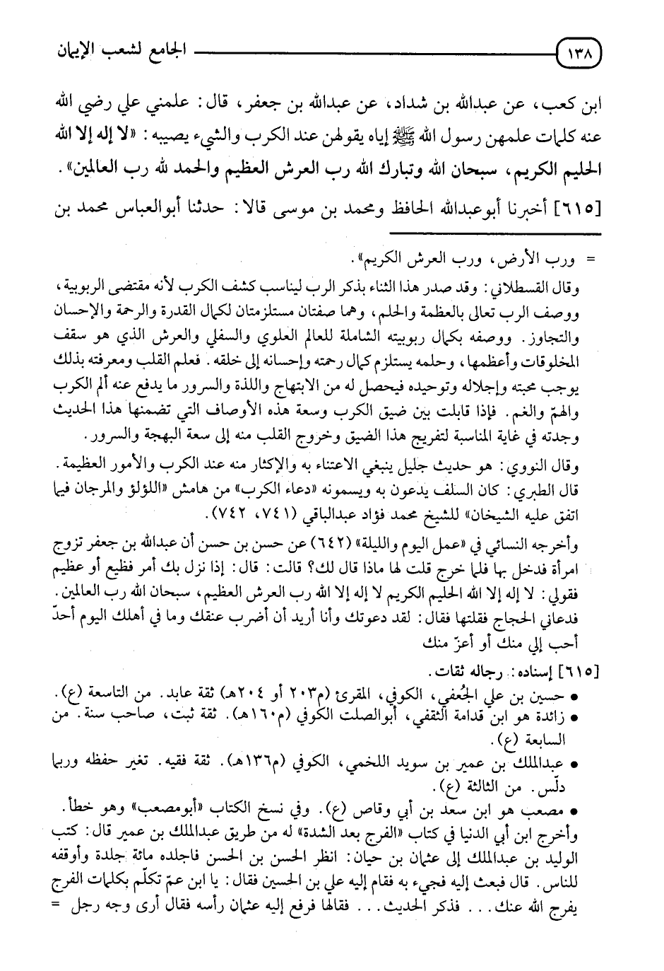 615 - أَخْبَرَنَا أَبُو عَبْدِ اللهِ الْحَافِظُ، وَمُحَمَّدُ بْنُ مُوسَى قَالَا: حدثنا أَبُو الْعَبَّاسِ مُحَمَّدُ بْنُ -[139]- يَعْقُوبَ، حدثنا الْحَسَنُ بْنُ عَلِيِّ بْنِ عَفَّانَ، حدثنا حُسَيْنُ بْنُ عَلِيٍّ، عَنْ زَائِدَةَ، عَنْ عَبْدِ الْمَلِكِ بْنِ عُمَيْرٍ، حَدَّثَنِي مُصْعَبٌ، أَنَّ عَبْدَ الْمَلِكِ بْنَ مَرْوَانَ، كَتَبَ إِلَى عَامِلِهِ بِالْمَدِينَةِ هِشَامِ بْنِ إِسْمَاعِيلَ أَنَّهُ بَلَغَنِي أَنَّ الْحَسَنَ بْنَ الْحَسَنِ، يُكَاتِبُ أَهْلَ الْعِرَاقِ فَإِذَا جَاءَكَ كِتَابِي هَذَا فَابْعَثْ إِلَيْهِ فَلْيُؤْتَ بِهِ قَالَ: فَجِيئَ بِهِ وَشَغَلَهُ شَيْءٌ قَالَ: فَقَامَ إِلَيْهِ عَلِيُّ بْنُ الْحُسَيْنِ فَقَالَ: يَا ابْنَ عَمِّ قُلْ كَلِمَاتِ الْفَرَجِ §" لَا إِلَهَ إِلَّا اللهُ الْحَلِيمُ الْكَرِيمُ لَا إِلَهَ إِلَّا اللهُ الْعَلِيُّ الْعَظِيمُ سُبْحَانَ اللهِ رَبِّ السَّمَاوَاتِ السَّبْعِ وَرَبِّ الْعَرْشِ الْعَظِيمِ، الْحَمْدُ لِلَّهِ رَبِّ الْعَالَمِينَ، قَالَ: فَخَلَّا لِلْآخَرِ وَجْهَهُ فَنَظَرَ إِلَيْهِ فَقَالَ: أَرَى وَجْهًا قَدْ قُشِبَ بِكَذِبَةٍ، خَلُّوا سَبِيلَهُ وَلْيُرَاجِعْ أَمِيرَ الْمُؤْمِنِينَ "